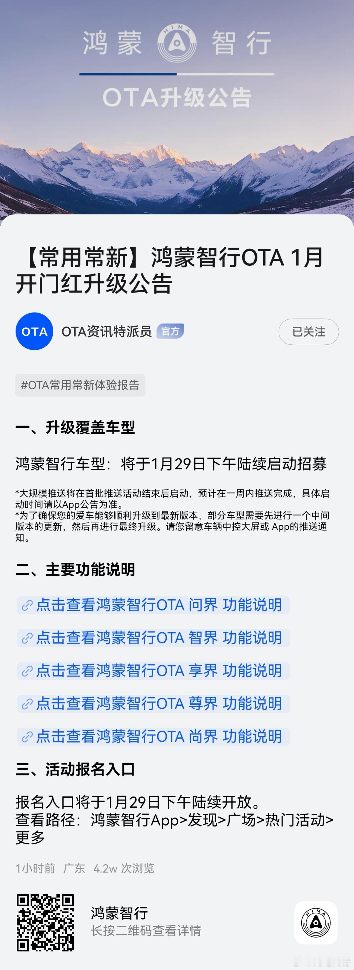 鸿蒙智行全系今天下午开始OTA推送新版本,不同车型功能有略微差异,具体以实际更新内容为准!鸿蒙智行问界汽车智界汽车尚界汽车尊界汽车享界汽车