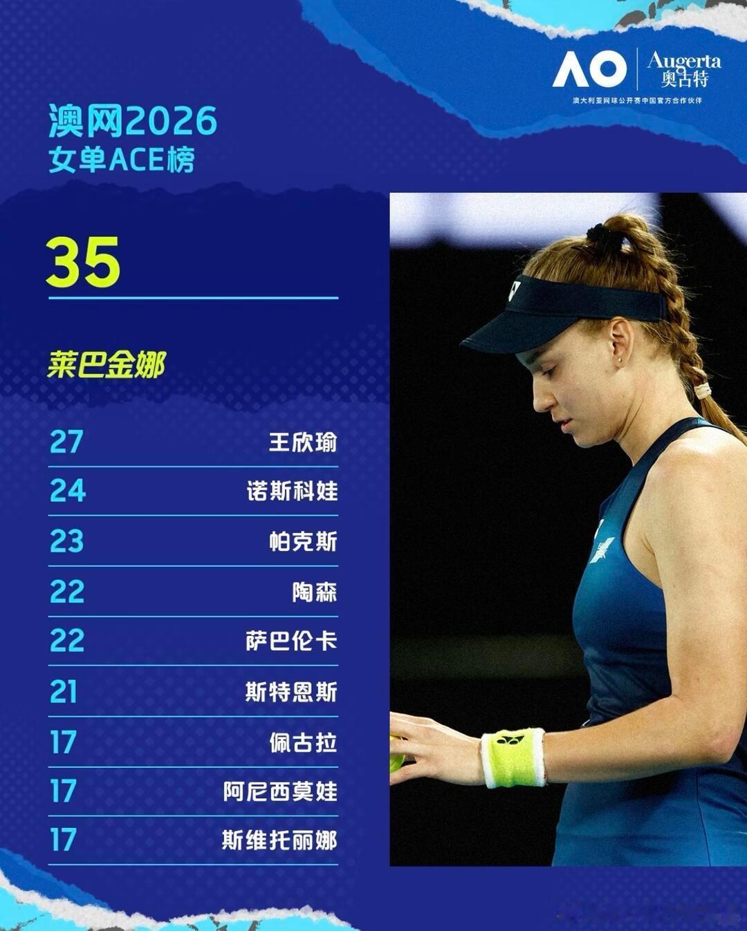 澳网ace球 莱巴金娜领先 王欣瑜排名第二澳网更新了截止的ace球榜,莱巴金娜和兹维列夫分列第一;中国🇨🇳金花王欣瑜本次澳网发球表现出色,虽然第四轮出局,依旧以27个ace排名第二今晚的半决赛莱巴金娜的ace会增加到多少关系到她能否晋级第二个澳网决赛,加油👏这很澳网澳网2026wta