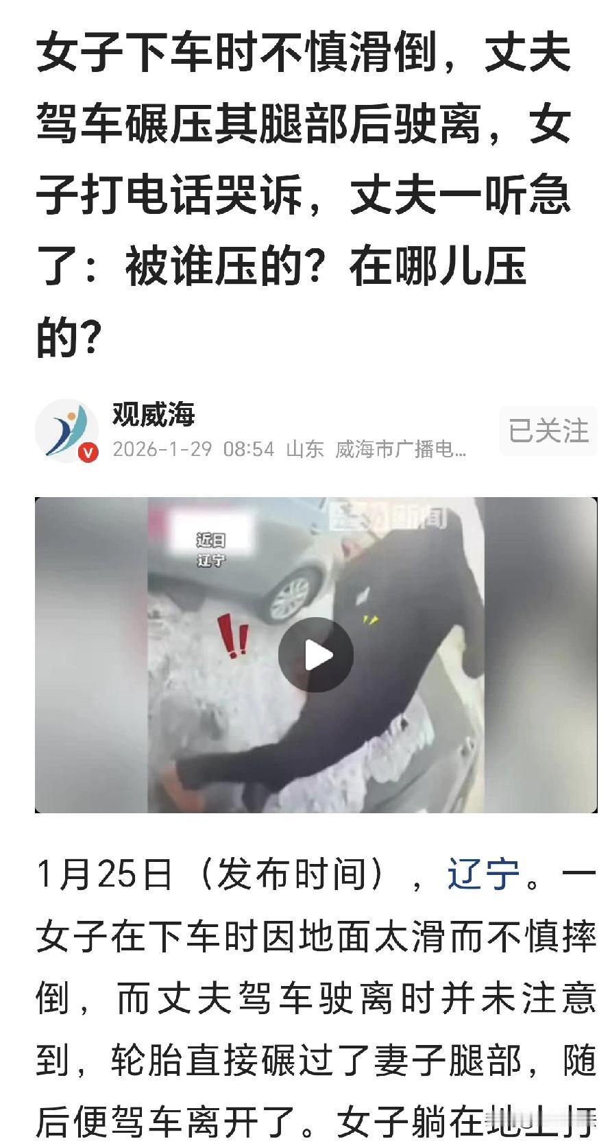 还好自家媳妇,否则明年保费又涨了!辽宁,一女子和丈夫驾车回去,到了地点,女子开门下去,可她脚下一滑,扑通一声摔倒在地,丈夫粗心大意,开车就从她腿上压了过去,女子剧痛,拿出手机给丈夫打电话: 我被车压了! 丈夫一听急了:被谁压的?在哪压的?女子咬牙切齿: 被你压的!丈夫立刻返回,带妻子到医院检查,好在骨头没事,网友: 不好意思,真的忍不住笑了! 一对夫妻像往常一样,丈夫开着车子,妻子坐在副驾驶位上。 两人有说有笑,一路开车往家失去,不大一会,就到了门口。 丈夫把车停下,妻子打开车门,一只脚刚踏到地面,就感觉脚底一滑,她呲溜一下滑倒在地,不受控制的朝着地面摔去。 这一跤摔得可不轻,她整个人躺倒在地,她撑起身子,刚想慢慢站立起来,谁知这时,丈夫一踩油门,缓缓开动了车子。 他压根就没注意,妻子下车时摔倒在地,他缓缓驶去,轮胎从妻子腿部碾了过去。 妻子没有防备,只觉得一阵剧痛,好像有无数根针在扎自己的腿部。 她大叫一声,疼得眼泪都飙出来了,直接躺在了地上,半天不能动了。 她缓了一下,强忍着剧痛,双手颤抖着掏出手机,她咬牙切齿的拨通了丈夫的电话,电话那头很快传来了丈夫的声音。 丈夫问道: 喂,老婆,咋啦? 妻子带着哭腔,声音颤抖:“老公,我被车压了!” 丈夫脑袋“嗡”的一下,她刚才下车,明明周围没车开走,他瞬间懵了,着急忙慌地询问妻子:“被谁压的?在哪压的?” 妻子大哭,又疼又委屈:“被你压的!” 丈夫如梦初醒,这才想起来刚才自己开车,好像是车下面垫了一下,他当时没有在意,以为是路面上有其他的东西。 他完全没意识到那是自己的老婆,老婆刚刚下车,他就迫不及待的开动了车辆! 丈夫意识闯了大祸,他心急如焚,顾不上多问,赶紧挂断了电话,一脚油门就掉头回去。 到了刚才停车的地方,妻子在地上坐着,脸上满是哭过的痕迹。 妻子看到他来,恨得想扑上去打他,可是腿疼,只有让他先扶起来自己。 妻子格登格登跳着走着,俩人上车之后,直奔医院先去检查。 到了医院,医生给妻子拍了片子,所幸的是,妻子骨头没有受伤,只是肌肉皮肤被碾压伤了。 医生告诉他们,需要休息,过一阵子就会恢复,丈夫这才长舒了一口气,悬着的心也终于落了地。 他满脸愧疚,因为自己的粗心大意,让自己的妻子遭这么大罪。 有人说道: 这丈夫是真的不看后视镜呀,虽然不该笑,但是真的忍不住呀! 以前在驾校的时候,一个女生被压到脚,叫的老惨了,然后开车的小伙,又倒了一把,又是一声惨叫。 也有人说,看地上有冰雪,坑坑洼洼的,而且松软,所以司机没感觉到这很正常,不可能会故意压到。 一网友分享自己的经历: 我昨晚在家后边街道,那会有点堵,骑电动车脚支地在等,旁边一个骑三轮车的大爷车轮压着我的鞋子就过去了,我喊他,他也装没听见跑了。 还好是雪地,雪地是软的,否则骨头肯定要伤到,这也算是扳回一局。 这位丈夫肯定平时没少被媳妇打骂,还好压的是自家媳妇,否则明年保费又涨了! 这事虽然有惊无险,但也给我们敲响了警钟,我们常常会因为疏忽大意犯下错误,有时候这错误可能会带来严重的后果。 就像这位丈夫,如果他在开车前多留心一下周围的情况,确认妻子下车安全后再离开,也许就不会发生惊险的一幕。 所以,做任何事情都要细心谨慎,多一份细心,就多一份安全,多亏这次骨头没事,可少不了回家会遭到批评,就连老人也会收拾他一顿! 对此,你怎么看?