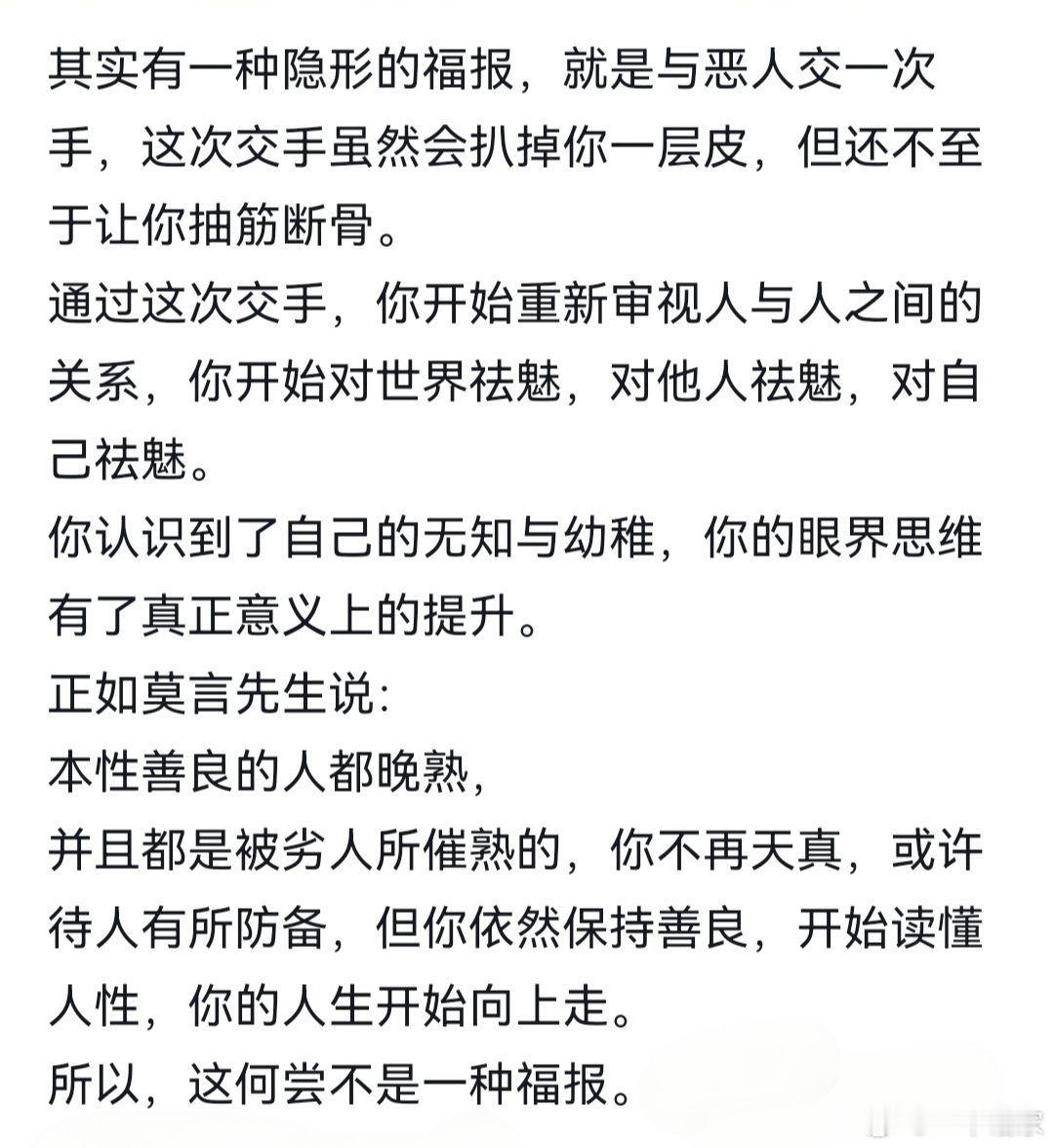 莫言说:本性善良的人都晚熟,并且都是被劣人所催熟的,你不再天真,或许待人有所防备,但你依然保持善良,开始读懂人性,你的人生开始向上走所以,这何尝不是一种福报