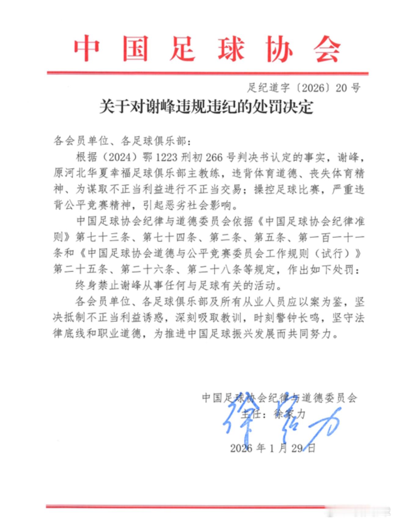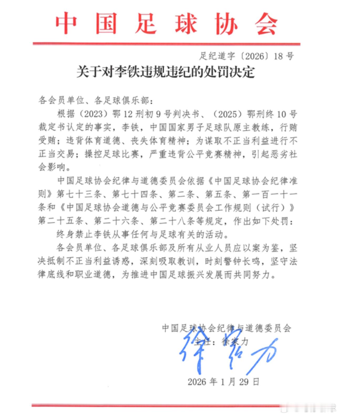 1月29日讯 今天上午10点,公安部、体育总局、中国足协在北京联合召开足球行业“假赌黑”问题专项整治行动新闻发布会。随后中国足协官方公布对涉案人员的处罚决定,对陈戌源、李铁、郝伟、谢峰等73名从业人员,给予终身禁止从事任何与足球有关的活动的处罚。足球行业假赌黑专项整治发布会将举行中国男足