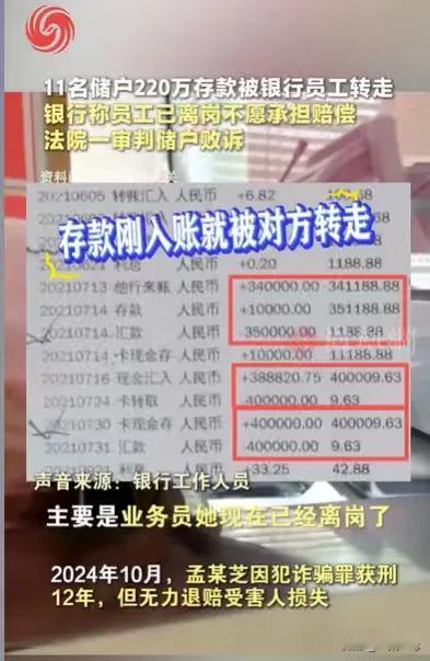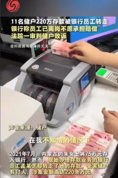 “太荒唐了!”内蒙古呼和浩特,女子去存75万元,是在窗口办理的,在不知情的情况下,她的钱汇到了别人的卡,她的75万,被柜台里的工作人员转走了,受害人有11个,一共被转走了220多万,他们去讨个说法,却被告知这个工作人员已经离岗了,女子去起诉,让女子意想不到的事情发生了。 这太离谱了!朱女士明明把自己的75万,在窗口里存的,是工作人员帮忙操作的,她的钱,最后却无缘无故汇到了别人的卡上,被工作人员孟某芝给转走了。 这是摆明诈骗啊,在她不知情的情况下,钱无缘无故不见了,朱女士真的是很心疼,这75万,是她一辈子的积蓄,是她一辈子的血汗钱啊。 她那么努力,那么辛苦,那么节约,她只想把钱存起来,以备不时之需,她一直以为,只要钱存起来了,才能让他安心。 她记得很清楚,当初存钱的时候,她就是在窗口存的,工作人员也是在工作时间内,一直引导她怎么存钱,工作人员怎么说,朱女士就怎么做。 毕竟来柜台存钱,就是这么个流程,朱女士也不知道工作人员怎么去操作,她只知道把自己的材料给工作人员,工作人员说办妥了,那就是办妥了,一切是工作人员说了算,她只想把钱存起来,其他的,她也不懂。 现在她踏踏实实地把钱存起来,却被告知钱不见了,钱被孟某芝给转走了,这实在是荒唐离谱,这种事情怎么会发生在她的身上。 朱女士遇到这种事情,她当然着急万分,她当然想知道自己的钱,为何会被这个孟某芝给转走了。 这个时候,工作人员却告诉她,这个孟某芝已经离岗了,一句离岗了,朱女士就明显地感觉到他们在推卸责任。 可这是他们的工作人员把储户的钱给转走的,这是他们的监管不力,为何最后要储户来承担后果? 朱女士当然不愿意,自己辛辛苦苦挣来的75万,她在柜台规规矩矩地存钱,最后钱却无缘无故不见了,她当然要把这笔钱追回来。 此时,她去找孟某芝要钱,她这才知道,孟某芝根本无力偿还这75万,他欠的钱实在太多了。 被孟某芝转走钱的,不单单是朱女士,还有其他的储户,一共有11个人,他们的存款,一共220万余元,全部被这个孟某芝挥霍一空。 他们发现被骗之后,孟某芝已经为自己的行为付出了代价,他因为诈骗罪被判了刑,但他无力退款,把钱给回这些储户。 《刑法》第266条规定:诈骗公私财物,数额较大的,处三年以下有期徒刑、拘役或者管制,并处或者单处罚金;数额巨大或者有其他严重情节的,处三年以上十年以下有期徒刑,并处罚金;数额特别巨大或者有其他特别严重情节的,处十年以上有期徒刑或者无期徒刑,并处罚金或者没收财产。 如此一来,朱女士和这些储户的钱要不回来了,大家不甘心,钱是存起来被转走的,他们监管不力,被工作人员转走储户的钱,他们应当承担责任。 于是朱女士起诉了存款行,让她意想不到的是,一审中,她败诉了,这就意味着她的钱要不回来了。 朱女士当然不肯就此不了了之,她继续上诉,她要要回自己的辛苦钱。 那么你对朱女士的事情有何看法呢?