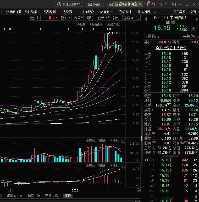 中国西电,圆弧顶呼之欲出中国西电,这一波电力配套炒作的龙头品种,在经过一段时间狂奔之后,疲态尽显。头顶三炷香不死也脱层皮,中国西电在1月21-26日连续四天收了上引线,这四根天线是创出历史新高并且是带巨量的那种,前两天我在群里也是做了风险提示。从1月27日开始,股价开始由5日线下移到10日线活动,今天盘中更是跌破了10日线。退潮是肯定的,还在里面的朋友,你要考虑清楚了,是继续博反弹还是及时出局?留给里面朋友的时间不多了。欢迎加入我们的免费交流群股票财经