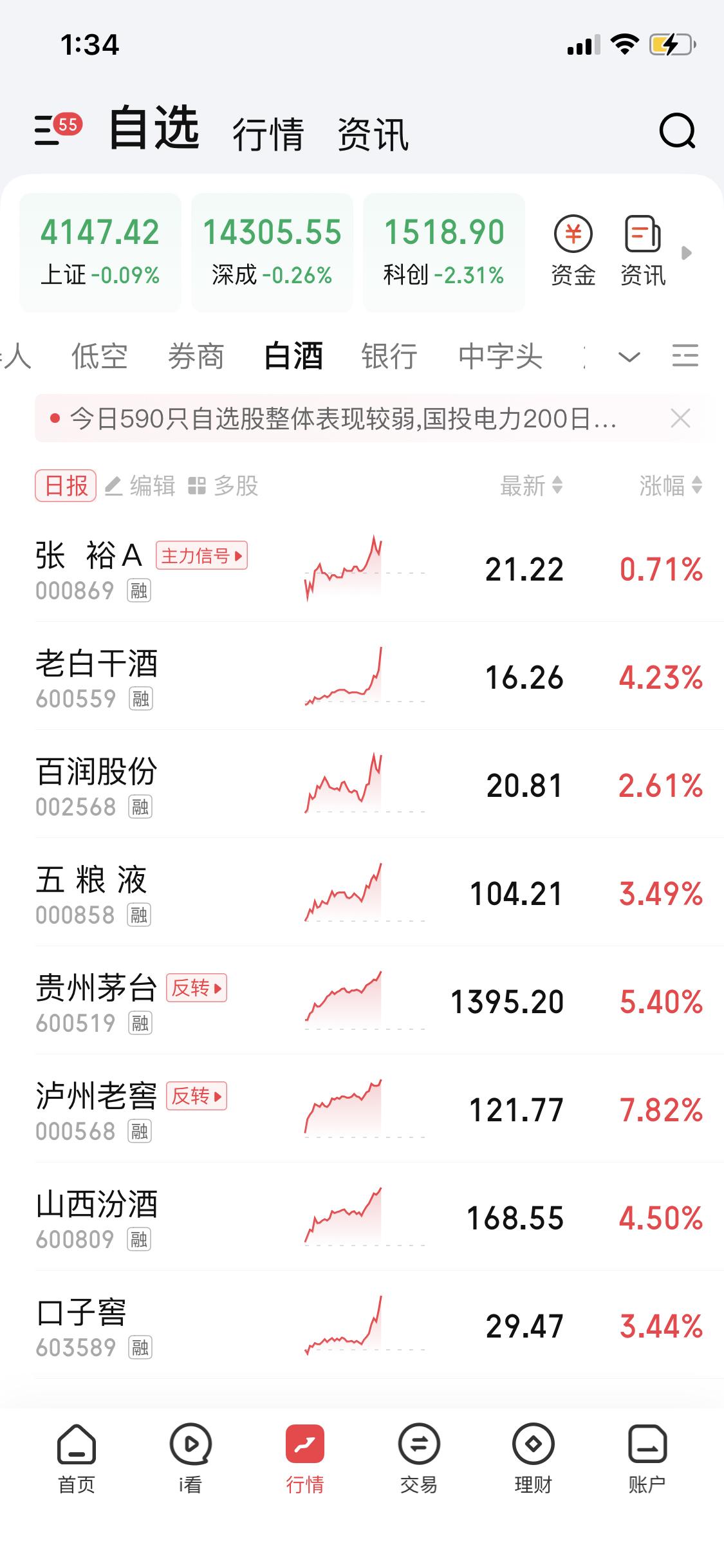 1月29日白酒板块那波大涨,可太让人惊喜了。就拿茅台、五粮液这些龙头股来说,股价那是蹭蹭往上涨。白酒一直是A股市场的热门板块,之前也经历过起伏,这次大涨估计让不少股民都乐开了花。 白酒板块的上涨,可能和春节消费旺季有关,大家走亲访友、聚会宴请都少不了白酒。而且白酒企业的业绩一般都比较稳定,有很强的品牌护城河。不过,股票市场风云变幻,这波大涨能持续多久还不好说。对于股民来说,还是得保持理性,别盲目跟风。