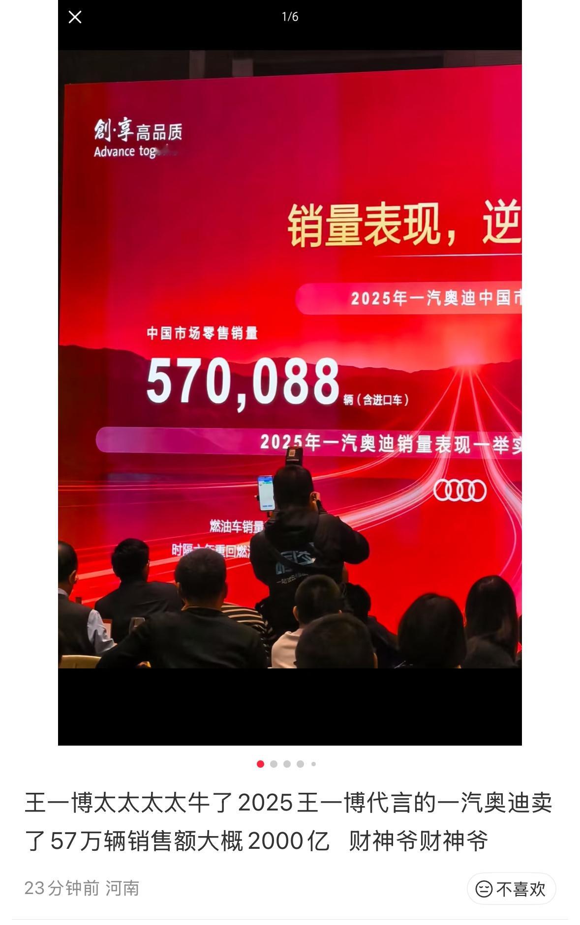 王一博代言的一汽奥迪销量57w,销售额大概2000亿。啊啊啊好🐮啊,行走的财神