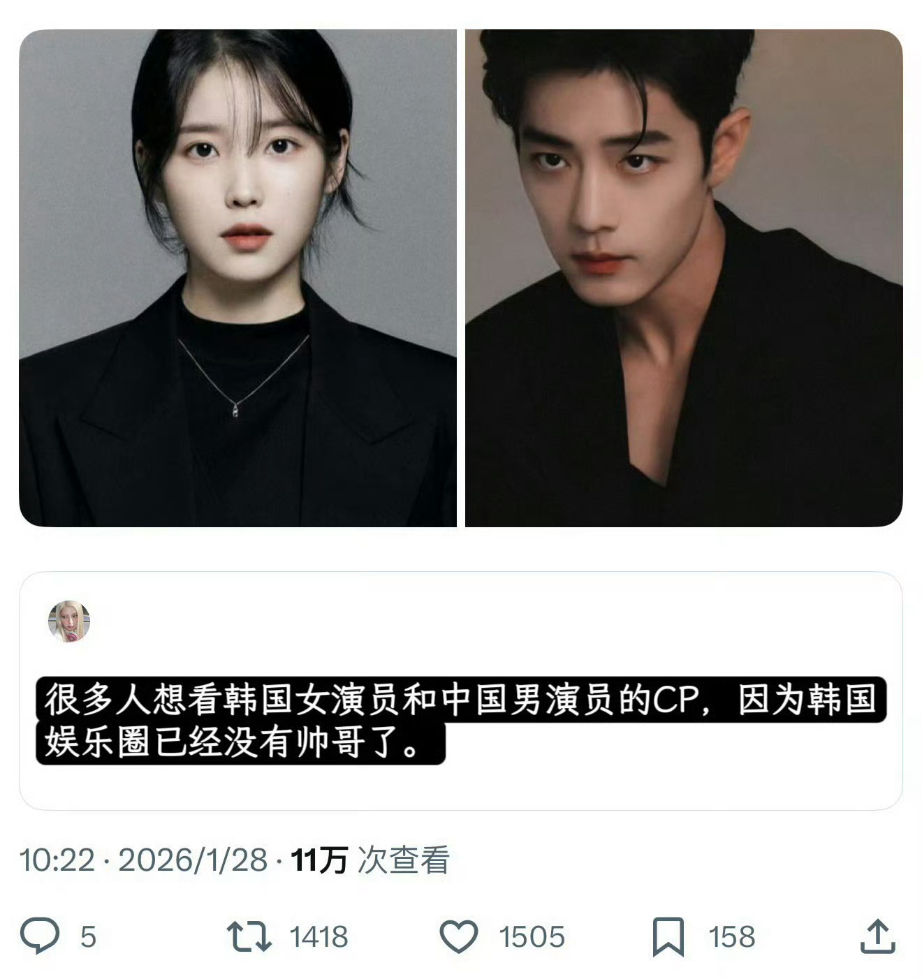 因为最近的韩剧男演员太愁,韩女正在给中国男演员和韩剧女演员拉郎配……首先就是中剧之王肖战+韩剧女王iu (韩女说的)