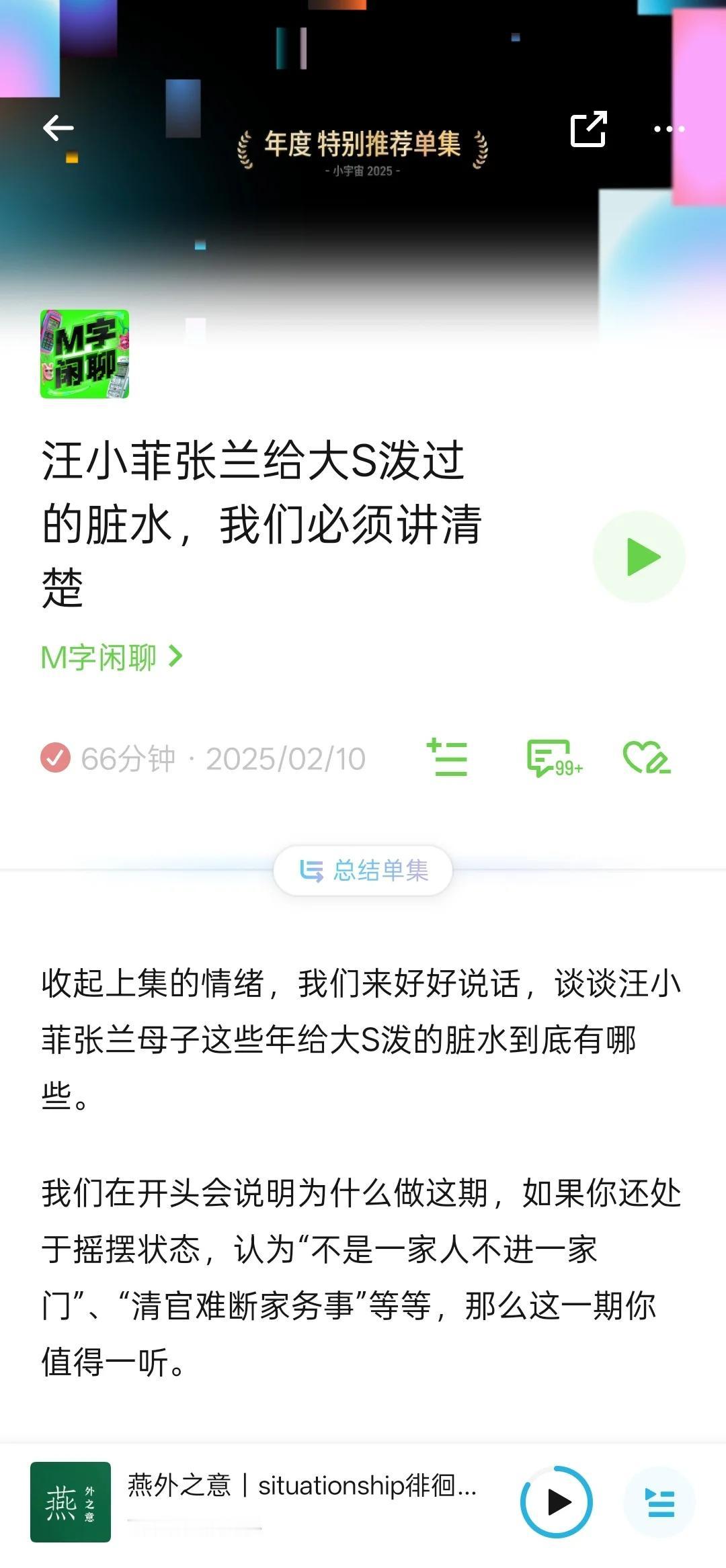 小宇宙年度特别推荐单集 谢谢这个奖让这集再次小火了一下。 推荐语:“在舆论最汹涌的时刻,这一集选择逆流而上,用严谨的时间线和证据链将谣言逐条拆解,把婚姻和经济纠葛拉回事实框架,这是对真善美的捍卫,也是对大s最好的纪念。”