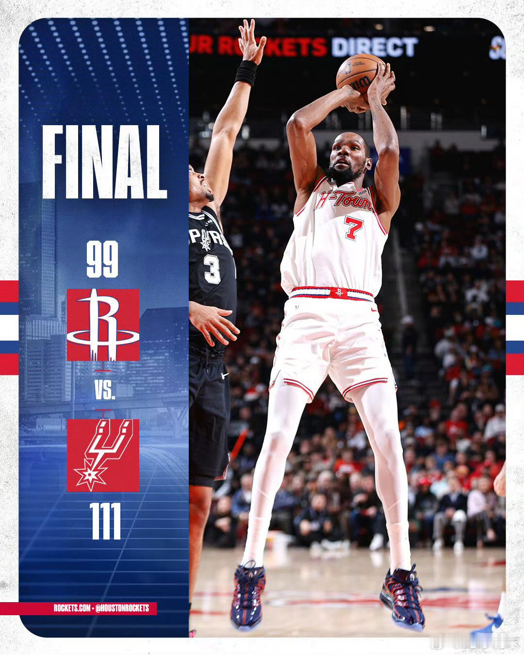 全场比赛结束!火箭99-111马刺!杜兰特24分2板6助、阿门25分7板4助3断、申京18分10板7助2断、伊森10分6板3断、谢泼德9分5板2帽、史密斯8分7板2助、卡佩拉5分4板2帽、奥科吉3板3助、芬尼史密斯2板、霍勒迪1助!马刺vs火箭休斯顿火箭
