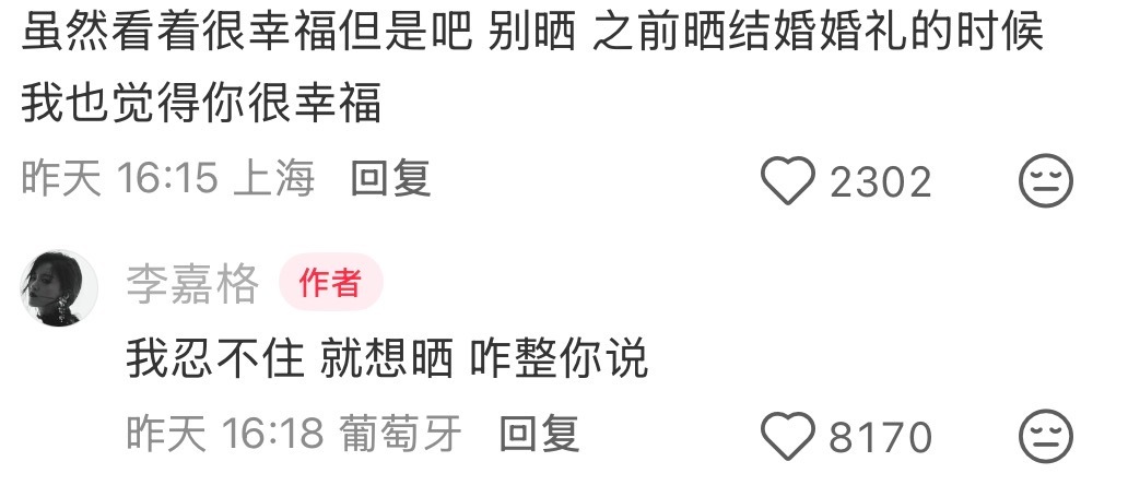 李嘉格 我忍不住就想晒李嘉格回复网友让她别晒恩爱 李嘉格晒与男友接吻照,网友评论让她别晒,李嘉格回复:“我忍不住,就想晒,咋整你说。”