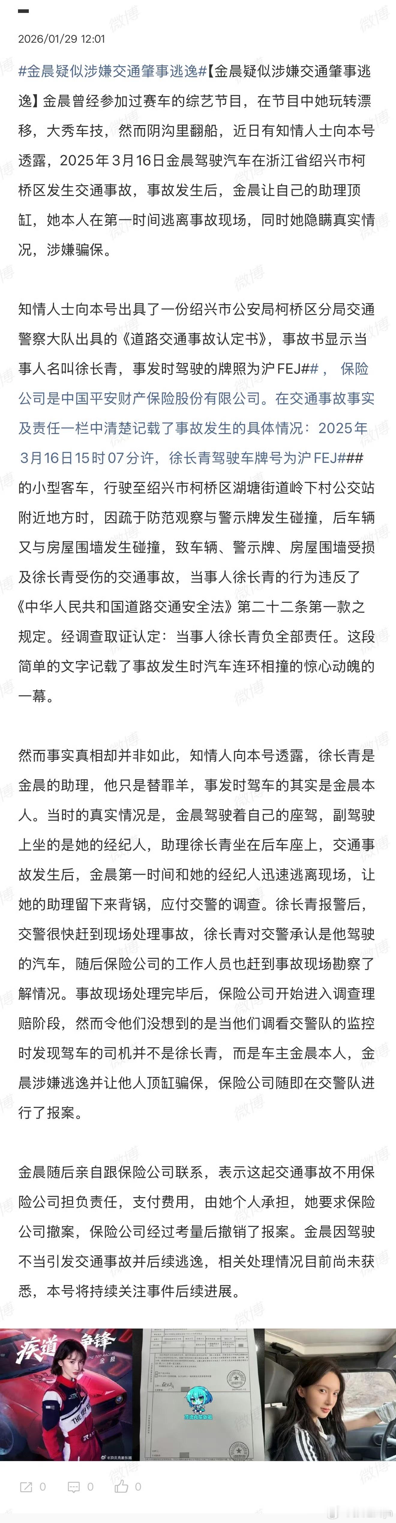 曝金晨肇事逃逸 啊是美女荷官金晨???前因后果写这么详细,还有事故认定书,感觉是
