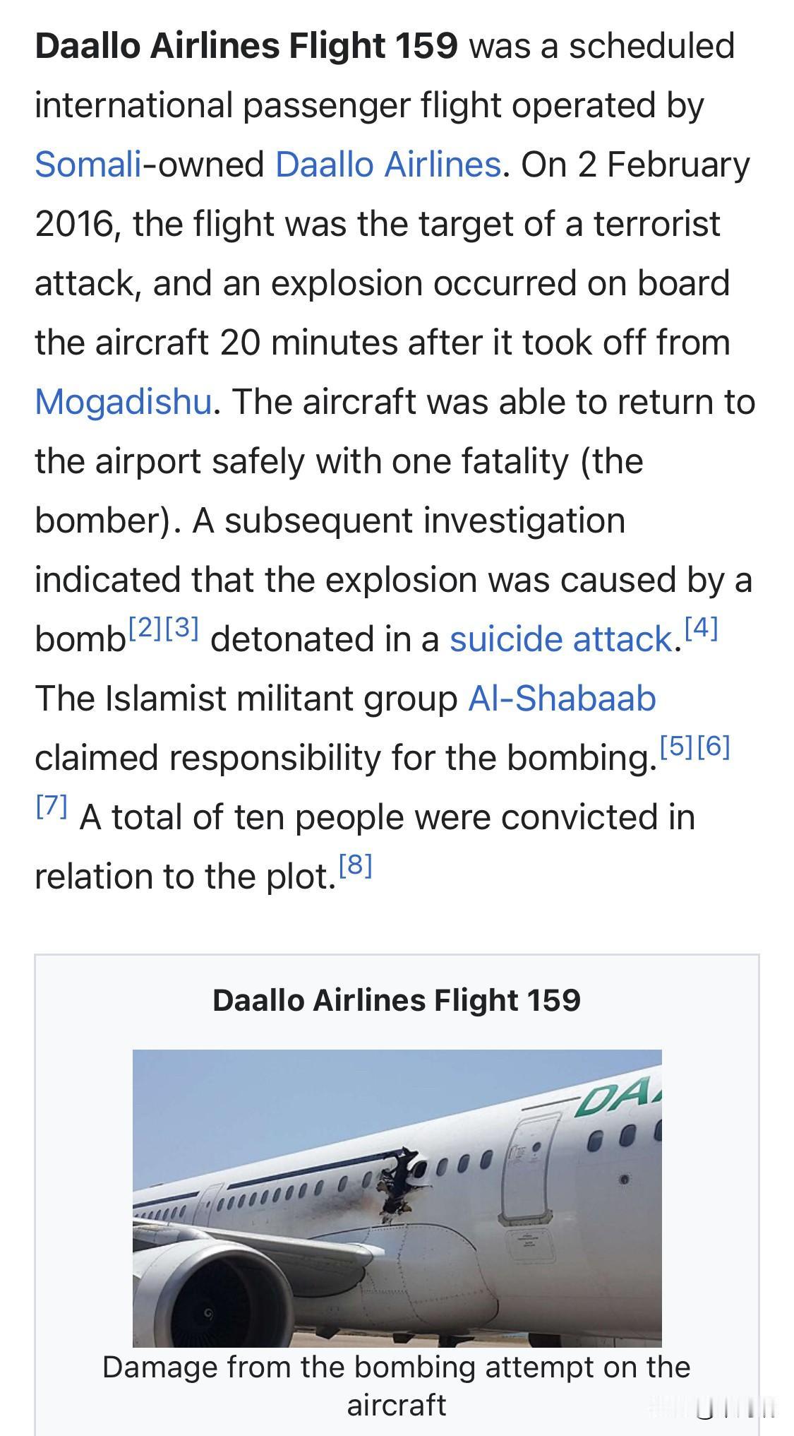 2016 年 2 月 2 日,达洛航空159号班机(Daallo Airlines Flight 159)从索马里摩加迪沙起飞 20 分钟后,一名自杀式炸弹袭击者引爆了藏在笔记本电脑中的爆炸装置。爆炸在机身上炸出一个洞,袭击者瞬间被吸出机舱,但飞机成功迫降,袭击者是唯一遇难者。 爆炸发生在约 4,267 米的高空。爆炸损坏了 R2 舱门后方、靠近油箱的机身。尽管飞机受损,机组人员和乘客仍安全返回摩加迪沙。 159号航班的机长是64岁的塞尔维亚人弗拉基米尔·“弗拉特科”·沃多皮韦茨;副驾驶是24岁的意大利人里卡多·博纳尔迪,他负责驾驶飞机,而沃多皮韦茨机长则负责监控飞机的仪表。两位飞行员都持有飞行执照和有效的体检合格证。 伊斯兰激进组织“青年党”(Al-Shabaab)声称对此次袭击负责。
