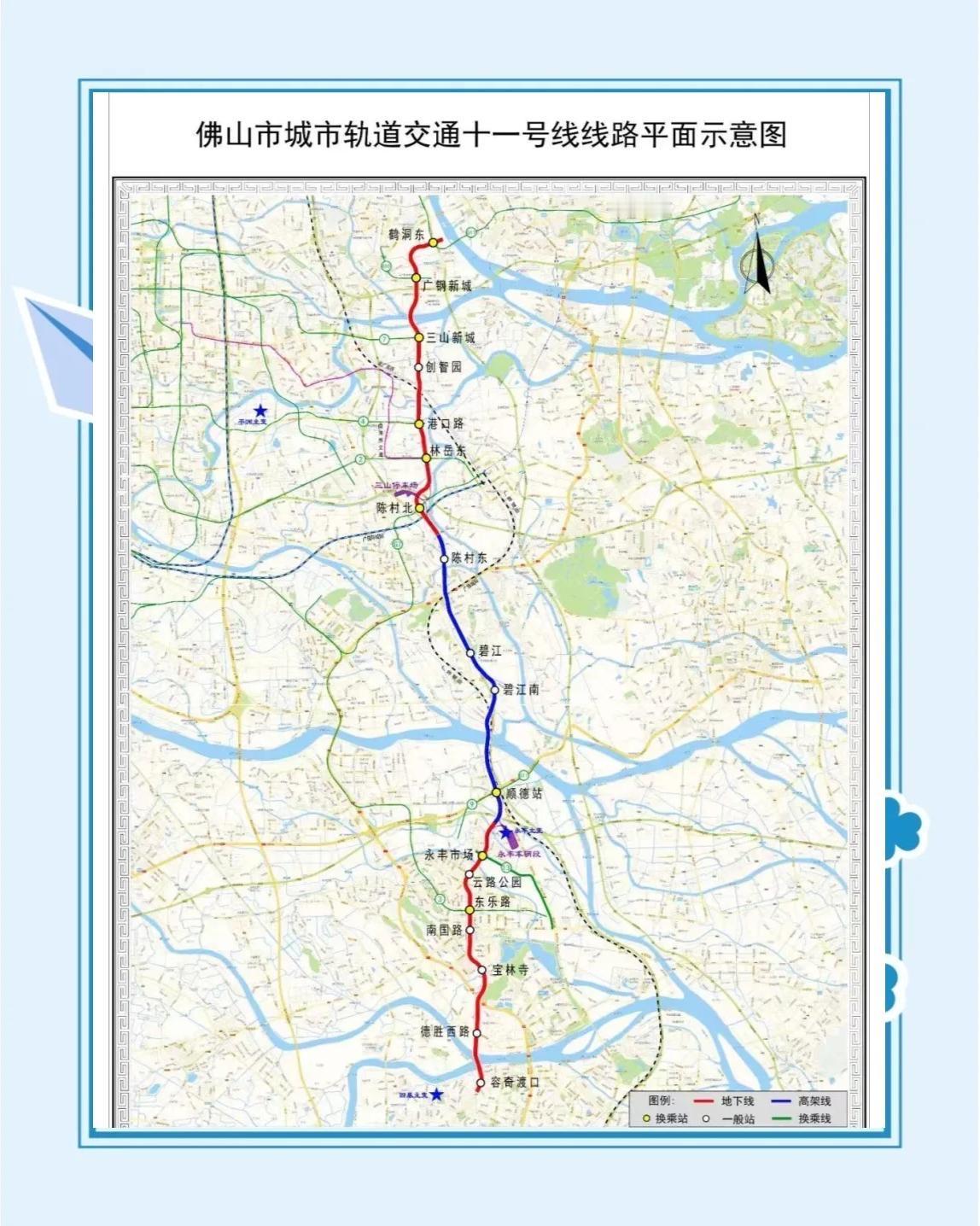 佛山地铁11号线 佛山市地铁11号线由南向北途经佛山市顺德区、南海区和广州市荔湾区,线路起于细滘站,终于鹤洞东站。线路全长约40km,共设车站22座,设车辆基地2座【永丰车辆段(顺德区境内)和三山停车场(南海区境内)】其中佛山段约36千米,设车站19座。广州段约4千米,设车站3座。 以后佛山和广州的往来肯定更频繁,不管是去顺德吃美食,还是到广州购物游玩,坐这地铁就搞定,想想都美!