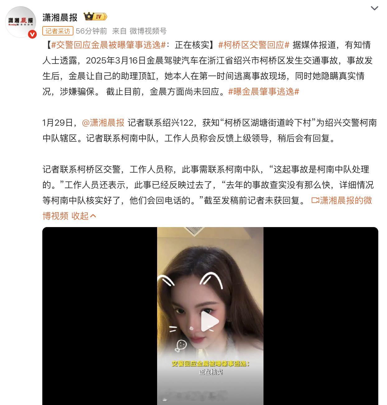交警回应金晨被曝肇事逃逸 接近一年前的事故了,目前还在等交警核实虽然是「撞击警示牌及围墙,造成车辆、设施损毁」,不过让助理顶包这种方法,也是非常不应该了……曝金晨肇事逃逸 42how