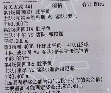 007 欧罗巴 帕纳辛纳科斯vs罗马帕纳辛纳科斯+0.75 平 1-1 2-2014 欧罗巴 里尔vs弗赖堡弗赖堡+0.5 平 0-0 1-1006 欧罗巴 波尔图vs格拉斯哥流浪者波尔图-1.5 让平 2-0 4-2005 欧罗巴 里昂vs塞萨洛尼基进球数双 平 1-1 2-22串:007平 014平4串:007平 014平 006让平 005平成绩串:007(1-1 2-2)006(2-0 4-2)014(0-0 1-1)