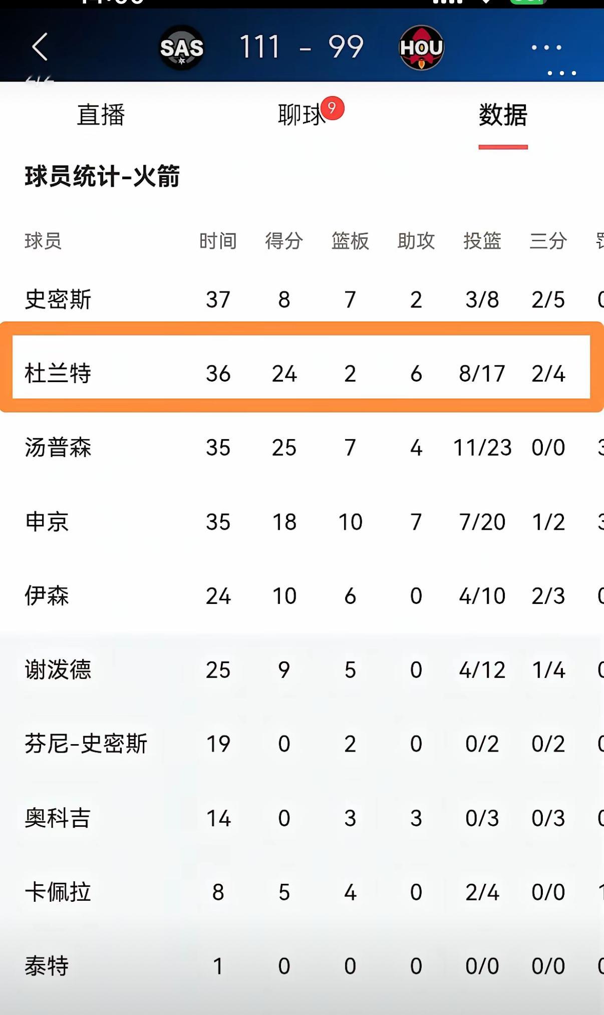火箭巨星杜兰特在比赛关键时刻选择了隐身!在今天火箭主场以99:111不敌马刺的比赛中,杜兰特在大部分的时间里都表现出色,然而到了第四节比赛的关键时刻,杜兰特却选择了隐身。整场比赛下来,杜兰特首发出战36分钟,投篮17中8,其中三分球4中2、罚球6中6得到24分2篮板6助攻,还有3次失误,他的场上正负值为-9。值得注意的是,在第四节比赛中杜兰特投篮4中1仅仅得到4分,杜兰特在末节比赛中的低迷是火箭输球的重要原因之一。nba杜兰特 马刺战胜火箭