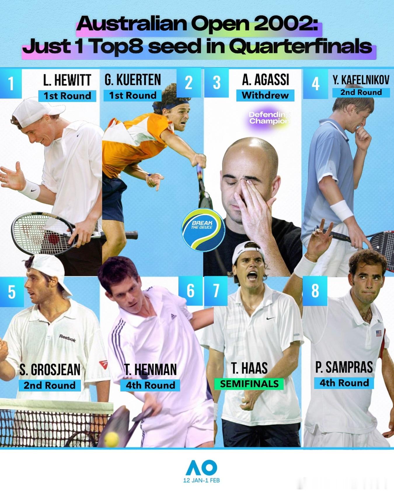澳网历史上大种子爆冷最多的一年2026澳网男单是很稳定的一届,前8种子有7位打进8强,四强甚至是前四种子!历史大种子表现最糟糕的一届是2002年,当时前8种子只有哈斯打进8强,卫冕冠军阿加西甚至手腕伤退赛;成就了托马斯.约翰森🇸🇪的黑马大满贯(亚军是萨芬)这很澳网澳网2026ATP