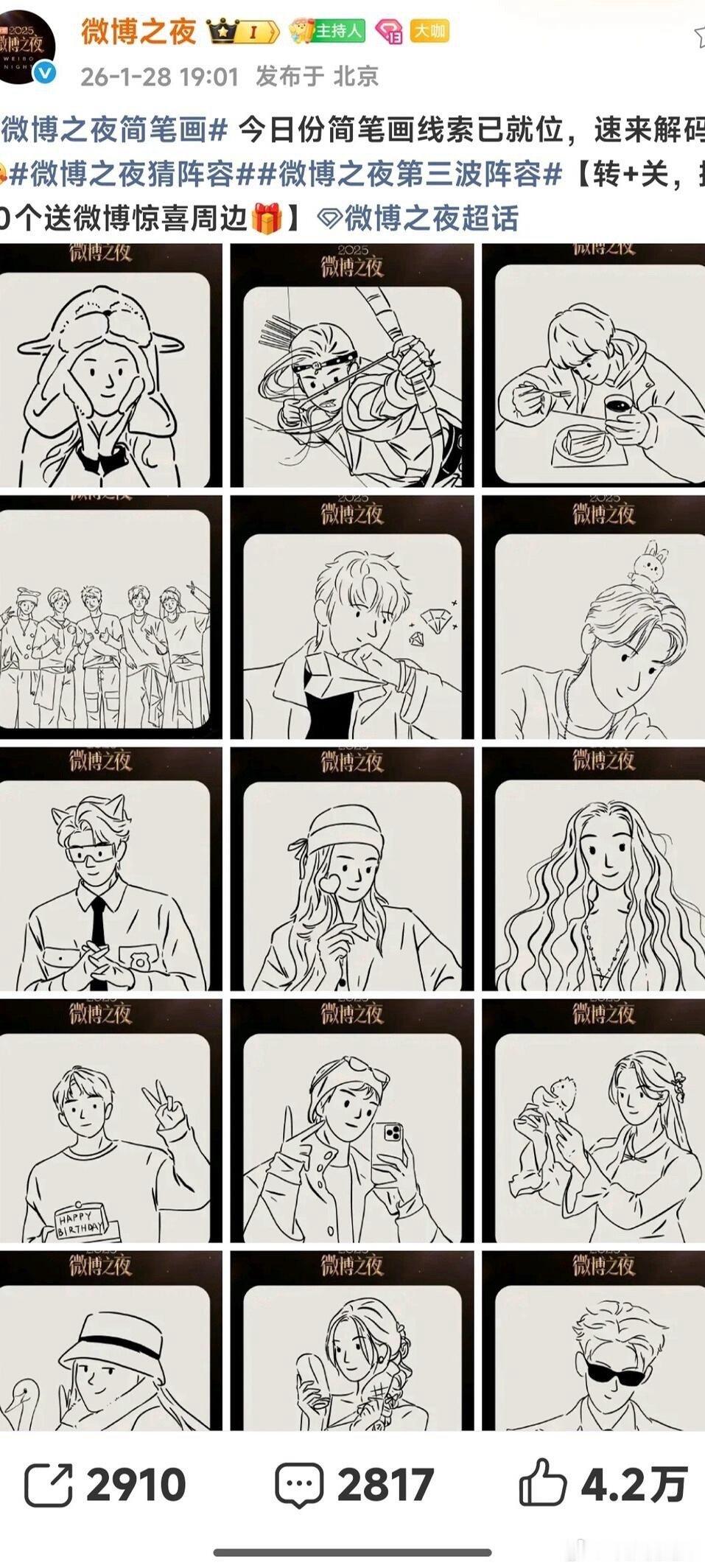 「微博之夜」简笔画阵容揭秘!新增第三弹:陈都灵,陈丽君,陈哲远,登陆少年团,邓为,段宜恩,丁禹兮,关晓彤,彭昱畅,宋威龙,宋轶,宋祖儿,张凌赫,张远