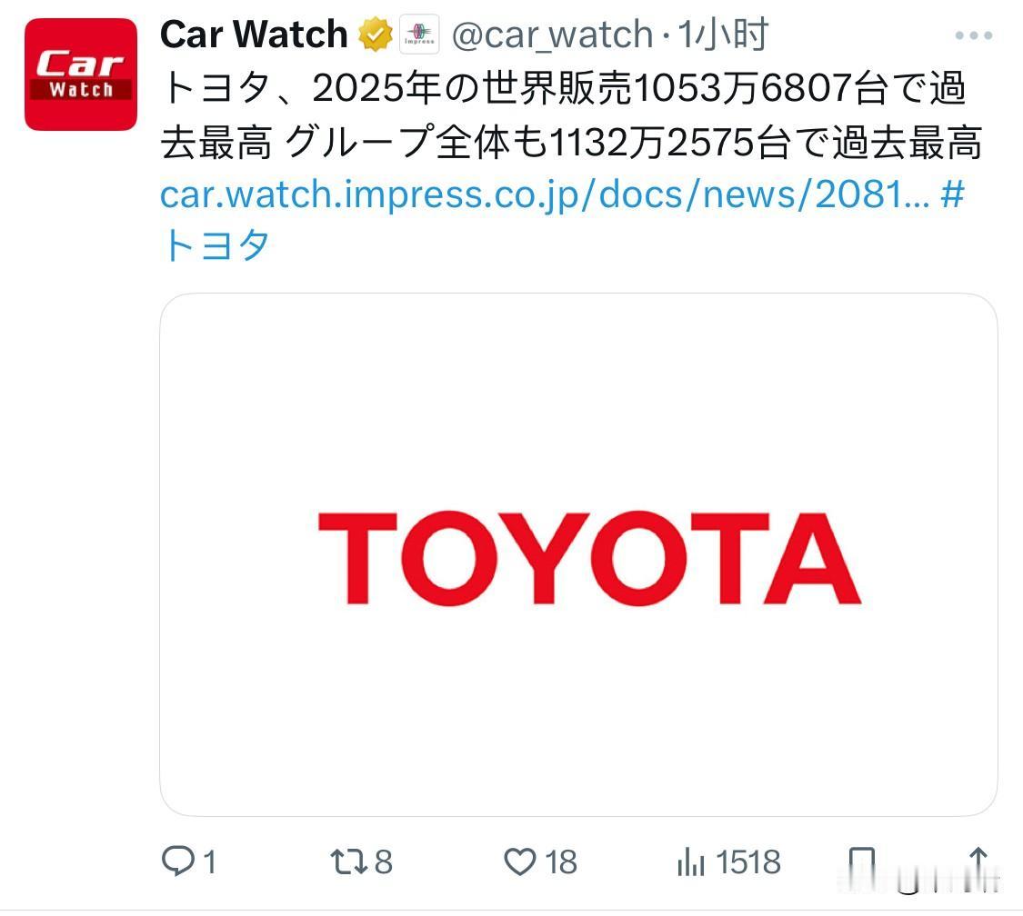 丰田汽车2025年的全球销量将达到创纪录的10,536,807辆,含大发、日野在内的集团总销量将达到创纪录的11,322,575辆。