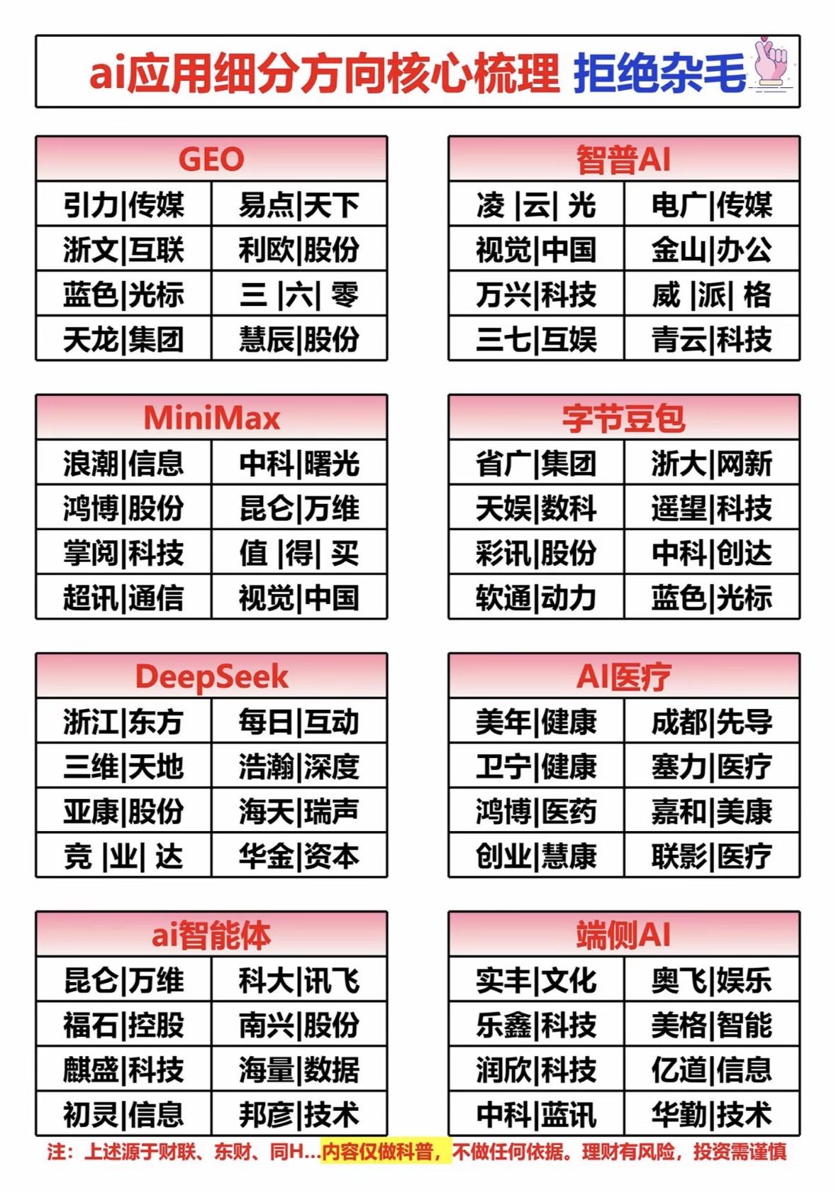 AI应用细分方向梳理,拒绝杂毛,精准投资! AI应用赛道梳理:传媒、医疗、科技多领域布局,核心标的引关注。风险自担,谨慎决策。