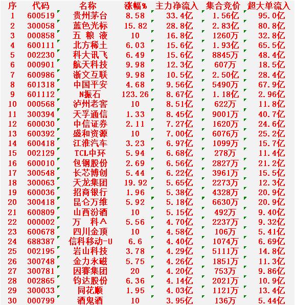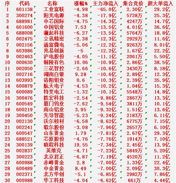 1月29日收盘,主力资金,已经大幅卖出的30名单: 工业富联:净流入 -65.0亿元 阳光电源:净流入 -17.9亿元 中芯国际:净流入 -14.3亿元 中国铝业:净流入 -13.5亿元 澜起科技:净流入 -13.5亿元 立讯精密:净流入 -12.3亿元 通富微电:净流入 -12.2亿元 兆易创新:净流入 -12.2亿元 沪电股份:净流入 -11.1亿元 铜陵有色:净流入 -10.9亿元 1月29日收盘,主力资金“大幅买入”的30名单: 贵州茅台:净流入 33.4亿元 蓝色光标:净流入 28.8亿元 五粮液:净流入 16.8亿元 北方稀土:净流入 15.6亿元 科大讯飞:净流入 15.6亿元 航天科技:净流入 12.3亿元 浙文互联:净流入 10.5亿元 中国平安:净流入 9.56亿元 N振石:净流入 8.67亿元 泸州老窖:净流入 8.51亿元 天孚通信:净流入 8.45亿元 中信证券:净流入 7.27亿元 盛和资源:净流入 7.00亿元 江淮汽车:净流入 6.97亿元 TCL中环:净流入 6.68亿元 包钢股份:净流入 6.56亿元 长芯博创:净流入 6.22亿元 天龙集团:净流入 5.65亿元 招商银行:净流入 5.38亿元 昆仑万维:净流入 5.18亿元