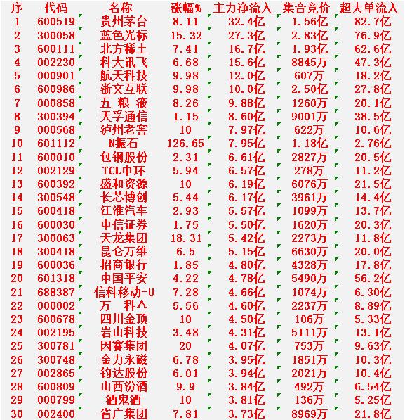 1月29日尾盘30分钟,主力资金“大幅抢筹的”30名单一览! 贵州茅台:净流入 32.4亿元,集合竞价成交额 1.56亿元 蓝色光标:净流入 27.3亿元,集合竞价成交额 2.83亿元 北方稀土:净流入 16.7亿元,集合竞价成交额 1.93亿元 科大讯飞:净流入 15.6亿元,集合竞价成交额 8845万元 航天科技:净流入 12.0亿元,集合竞价成交额 607万元 浙文互联:净流入 10.0亿元,集合竞价成交额 2.50亿元