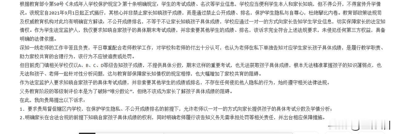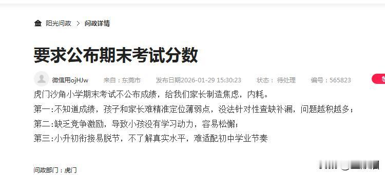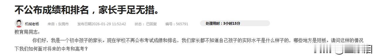 今天看到有家长在东莞阳光网上投诉学校不公布分数,看教育局怎么回复。我觉得教育局还是得听听家长们的心声,不能一刀切。 有网友说自己小孩的成绩都不让知道,那考试的意义何在,中考的意义何在。那些玻璃心家长,不想知道的,就不要告知就好了,一个人的意见,为什么能代表所有的家长。 网友说非常贊同,孩子已经不是小学生了,不管学得好坏,公布考试成绩是对孩子一个学期努力付出的成果一种检验,不管成绩好坏,家长和孩子也有一个更清晰的方向,未来该如何走也更好规划。考试不止止是成绩,更是对孩子成长路上的一种考验。 网友说成绩是检验学习阶段性成果的体现,这样以后只有老师的孩子能知道自己的成绩,这是不是对大众的不公呢?只要有中考高考,就要面对分数。那些主张不显示成绩的家长究竟占比多少?还是谁哭谁有理?教育局是不是也得听听大多数家长的意见,了解下真正的民意??