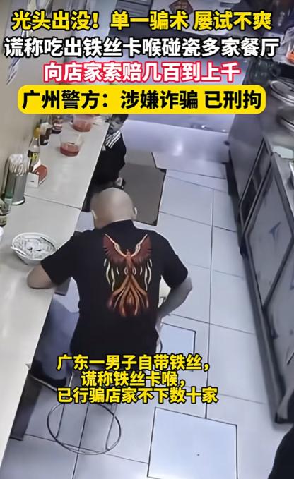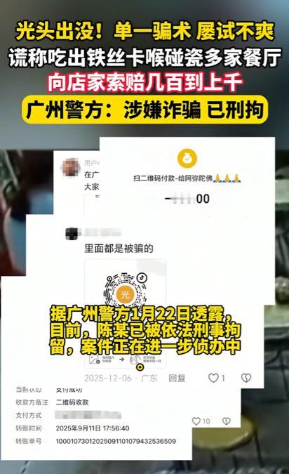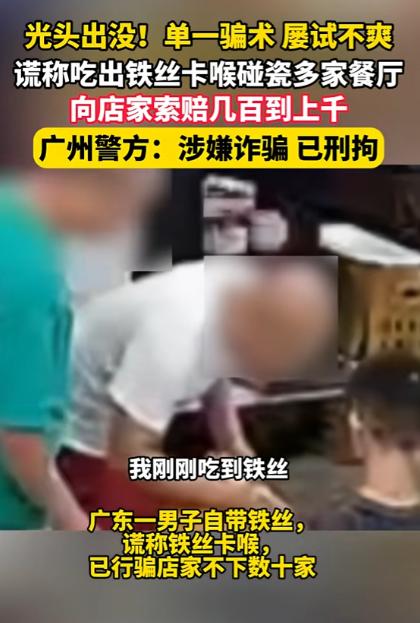 “必须严惩!”广东,一男子去饭馆吃猪脚饭,结果快要吃完时,大声喊来店主,说自己吃到了钢丝球,向店主索赔,店主赔钱后的当晚得知周边同行也遇到过这种情况,当即就报了警! 广东,一光头男子进入一家猪脚饭用餐,点了一份经典猪脚饭,找了个靠近角落的位置坐下。 全程男子都显得很安静,低头慢慢吃饭,店主也没太在意,照常忙着自己的活,可就在男子把碗里的饭吃到只剩几口时,突然猛地捂住喉咙,眉头紧皱,还用力咳嗽了几声。 随后一拍桌子大声喊来店主,语气激动地指着碗里的东西,说饭里吃出了铁丝,还卡在了喉咙里,现在咽口水都疼,要求店主立刻带他去牙科诊所和市级医院做全面检查。 店主赶紧凑过去看,果然在碗底看到了一小截细细的钢丝,心里一下子慌了神,想着自己平时后厨操作都很小心,怎么会出现这种情况。 可当着客人的面,又怕对方闹起来影响店铺声誉,毕竟小本生意,靠的就是街坊和回头客的口碑,真要闹到市场监管部门,后续的麻烦事只会更多。 男子见店主面露迟疑,更是不依不饶,一边捂着喉咙装作难受的样子,一边提出了赔偿要求,除了要 500 元的医药费,还要 80 元的烟钱当作压惊费,另外还有 20 元的交通费,三项加起来一共 600 元。 还说如果店主不答应,他就当场打电话投诉,还要把这事发到网上,让大家都知道这家店的卫生有问题。 店主被男子的话逼得没办法,想着多一事不如少一事,哪怕自己吃点亏,也别让店铺的名声受影响。 于是当场转了 600 元给男子,男子拿到钱后,也没再提去医院检查的事,简单说了几句狠话就匆匆离开了,整个过程前后不过十几分钟,可店主心里却堵得慌。 本以为这事就这么过去了,店主只是自认倒霉,可到了深夜关店后,他在本地餐饮同行的微信群里随口提了一嘴这事,还描述了一下这名光头男子的体貌特征。 没想到消息发出去没多久,立刻有两位同行出来回应,说自己的店也遇到过一模一样的人。 一位开快餐小炒店的店主说,半个月前这名光头男子也去他店里吃饭,吃到最后说吃出了铁丝卡喉,索要了 266 元的赔偿,他也是怕麻烦赶紧给钱了事。 三人一算,光是他们三家店,被这名男子碰瓷的损失就已经超过了一千元,店主这才恍然大悟,自己哪里是遇到了卫生问题,分明是碰上了职业碰瓷的。 对方就是掐准了小餐馆店主怕投诉、怕闹事的心理,专挑这样的店铺下手。 越想越气的店主当即决定报警,同时还把自己的遭遇和男子的特征整理出来,发布在了社交平台上,提醒更多的餐饮同行注意防范。 这条视频很快在本地餐饮圈传开,不少店主都留言说见过这名男子,还有的店主差点就被碰瓷成功,这也让警方意识到,这并非一起孤立的诈骗案件,背后可能是嫌疑人多次作案的系列骗局。 广州市公安局迅速成立了专案组,针对这条线索展开了深入的调查研判,办案民警第一时间调取了三家被碰瓷店铺的监控录像,还走访了周边的餐饮商户,收集相关的证据线索。 监控画面里的细节,让嫌疑人的作案手法一目了然。办案民警发现,这名光头男子也就是陈某,每次进入餐馆后,都会刻意选择角落或者监控死角的位置落座。 点餐之后就会趁店员忙碌、不注意的时候,从口袋里掏出随身携带的洗碗钢丝球,捏下一小截钢丝揉成小团,悄悄丢进自己的餐食里。 随后就装作正常吃饭的样子,一直吃到餐食快见底时,才开始上演喉咙被卡、索要赔偿的戏码。 而且陈某专挑小型餐馆下手,这些店铺大多是夫妻店或者小作坊,后厨管理相对简单,店主也大多想着和气生财,不会过多纠缠,这也让他的碰瓷行为屡屡得手。 警方还通过串并案件发现,陈某从 2025 年 5 月就开始用这种手法作案,在广州多个区域的街边餐馆实施诈骗,每次骗取的金额从 266 元到 1480 元不等。 得手后就会立刻离开现场,前往下一个区域继续作案,在短短数月的时间里,连续诈骗了多家餐馆,给餐饮商户的正常经营造成了不小的负面影响。 根据监控录像里的体貌特征和行动轨迹,办案民警很快锁定了陈某的活动范围,随后展开了布控抓捕,没过多久就将陈某成功抓获。 陈某交代,自己游手好闲,不想踏实工作,偶然间发现小餐馆店主容易被碰瓷,就想到了随身携带钢丝球碰瓷的办法,本以为这种小打小闹的诈骗行为不会被警方重视,没想到最终还是落入了法网。 街边的小餐馆本就挣的是辛苦钱,店主们起早贪黑备料、出餐,守着一方小铺讨生活,容不得这样的不法分子来薅羊毛。 法律的红线从来都不容触碰,任何试图通过自导自演、伪造证据的方式谋取不正当利益的行为,终究逃不过法律的严厉制裁。 对于这件事,您有什么想说的吗?欢迎评论区留言讨论。 信源:杭州网2026-01-24——《光头出没!单一骗术却屡试不爽。广东一男子自带铁丝,谎称吃出铁丝卡喉碰瓷多家餐厅牟利,最终落入法网》