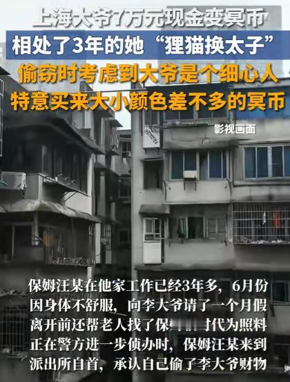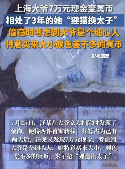 “也是没谁了!”上海,一大爷放在后备箱的10万现金中,有7万都被换成了冥币,而且家里的黄金戒指和项链也都不见了,谁知,大爷报警没多久,家里的保姆就过来自首了,而得知了对方偷窃的原因后,大爷心里五味杂陈! 2025年,上海一大爷年龄大了,子女都在外地工作,大爷平常在家一个人住,难免会有些不方便。 于是大爷的儿女们便给大爷雇了一个保姆,让保姆照顾一下大爷,大爷一辈子省吃俭用,他总觉得把钱存银行不方便,取个钱还要跑老远,还要排队。 所以就把自己辛辛苦苦攒下的10万块现金,小心翼翼地装在一个铁盒子里,放在了自己代步小汽车的后备箱里。 他想着,后备箱平时锁得严实,而且自己每天都要用车,时不时就能留意一下,这样既安全又方便,啥时候要用钱,随手就能取。 大爷平时是个出了名的细心人,做啥事儿都一丝不苟,每次放钱、取钱,都会仔细清点一遍,就连铁盒子的锁,都会反复检查好几遍,生怕出一点差错。 可谁能想到,就是这么细心的大爷,还是栽了个大跟头。前段时间,大爷要给老家的亲戚随份子,还要给小区门口的小卖部结清上半年的账,就想着去后备箱取点钱。 他打开后备箱,拿出铁盒子,打开锁的那一刻,还没觉得有啥不对劲,可伸手一摸,就感觉手感不对劲儿,大爷心里咯噔一下,赶紧把钱抽出来一看,瞬间就懵了,手里的钱差点掉在地上。 只见铁盒子里,外面几张是崭新的百元大钞,看着跟真的一模一样,可往里面一翻,全是花花绿绿的冥币。 这些冥币做得还挺 “讲究”,颜色、大小都跟真的百元大钞差不多,不凑近了仔细看,根本分辨不出来,估计是特意挑的款式。 大爷急得满头大汗,蹲在地上一张一张地数,数来数去,原本的 10 万块现金,就只剩下 3 万是真的,其余 7 万,全被换成了这不值钱的冥币! 这一下可把大爷急坏了,7 万块钱啊,那是他攒了好几年的养老钱,怎么说没就没了?他定了定神,赶紧跑回家,想着看看家里其他东西有没有丢。 一进家门,他就直奔床头柜,打开抽屉一看,心又凉了半截 —— 老伴儿生前留下的黄金戒指和黄金项链,也不见了。 那戒指和项链不算特别粗,但也是纯金的,不仅值钱,更重要的是有纪念意义,是大爷的念想,平时他都舍不得拿出来戴,小心翼翼地收在抽屉里,没想到也跟着遭了殃。 大爷又气又急,琢磨着这事儿肯定是熟人干的,不然谁能知道他把钱放在后备箱,还能神不知鬼不觉地换成冥币,就连家里的黄金首饰都能精准找到? 思来想去,大爷实在没办法,只能掏出手机,打了 110 报警,把自己的遭遇一五一十地跟民警说了一遍,希望民警能赶紧帮忙找到小偷,追回自己的钱和黄金。 民警接到报警后,很快就赶到了大爷家,一边安抚大爷的情绪,一边展开调查。他们先去查看了小区的监控,又仔细检查了大爷的汽车后备箱和家里的门窗。 发现门窗都没有被撬动的痕迹,后备箱的锁也完好无损,看来小偷是有钥匙,或者是大爷平时没锁好,趁机下的手。 民警又询问了大爷家里的情况,大爷说,家里平时就他一个人,只有保姆每天来家里照顾他的饮食起居。 有时候晚上也会住在家里,家里的钥匙、汽车后备箱的钥匙,保姆都有,因为他平时信任保姆,觉得她做事靠谱,从来没防备过。 民警听完后,就把保姆列为了重点排查对象,正准备联系保姆过来了解情况,让人没想到的是,大爷报警还不到两个小时,那个在他家做了 3 年的保姆,就自己打车赶到了派出所自首了。 据民警说,保姆到派出所的时候,眼睛红红的,脸上满是憔悴和愧疚,一见到民警,就忍不住哭了起来,没等民警询问,就主动交代了自己偷窃大爷现金和黄金首饰的全部经过。 这个保姆姓王,今年五十多岁,这 3 年里,王阿姨平时做事还算麻利,对大爷也挺照顾,她早就知道大爷把钱放在汽车后备箱里。 后来,她老家的老伴儿得了重病,住进了医院,需要一大笔手术费和治疗费,她跟老家的医院打听了一下,不算后续的康复费用,光是手术费就需要十几万。 她知道大爷细心,要是直接把钱偷走,肯定会被发现,所以就特意跑到小区附近的殡葬店,挑了那种颜色、大小都跟真钱差不多的冥币,想着用 “狸猫换太子” 的法子,一点点把大爷的钱换走。 王阿姨的行为已经涉嫌盗窃罪,涉案金额较大,虽然她有自首情节,主动退还了全部赃款赃物,认罪态度较好。 但按照相关法律规定,还是要被依法追究刑事责任,目前,王阿姨已经被警方依法采取刑事强制措施,案件还在进一步办理中。 平时一定要保管好自己的财物,不要把大额现金放在家里或者汽车后备箱里,就算是信任的人,也要多留个心眼,避免遭受不必要的损失。 再亲近的人,也抵不过一时的贪心,再稳妥的存放方式,也不如多一份防备心。 对于这件事,您有什么想说的吗?欢迎评论区留言讨论。 信源:荆楚网2025-08-19——《上海大爷7万元现金变冥币,一查才知是相处了3年的她"狸猫换太子”》