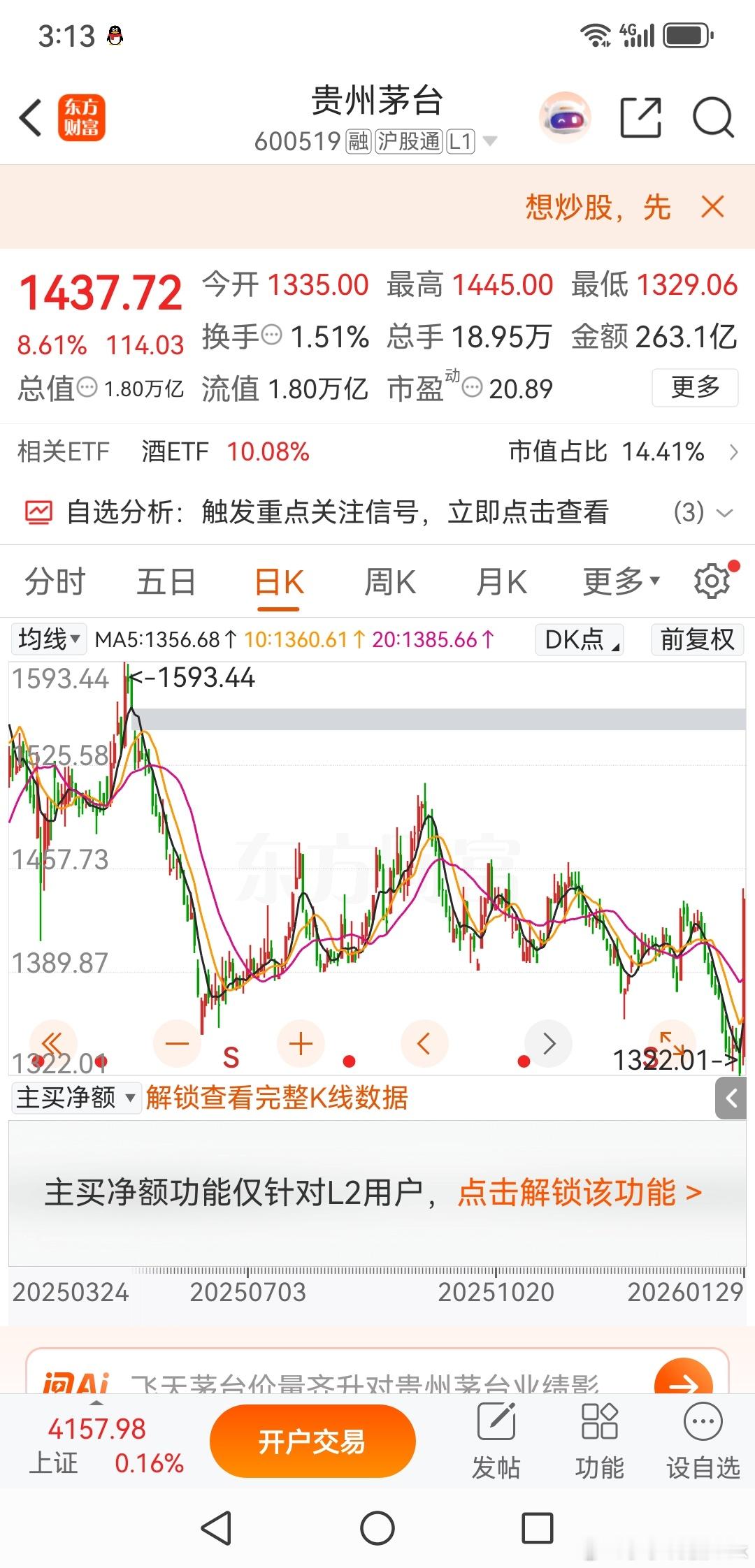 贵州茅台,反弹高度不容乐观贵州茅台,今天如有神助,史诗级的上涨,截止收盘大涨了8.61%,成交263个亿。贵州茅台在股价拉伸的同时,也带动了一大批白酒股票的上涨,茅台批发价格整箱突破1600的消息也被及时推送到我们的面前。对于今天贵州茅台的大涨,我认为只是一次对长期下跌的纠正,并不能理解为趋势扭转的开始,年线级别的下跌,没那么容易扭转的。上一次茅台的大涨,还是在25年924行情9月24日 大涨9.36% 成交133亿 收盘 1453.569月26日 大涨9.82% 成交143亿 收盘 1297.16很显然,今天的上涨和9月26日的上涨,具备一定的可比性。和25年9月26日相比价格、涨幅都是差不多的,但是今天的量比25年9月26日那天要大很多。为何价格和涨幅差不多,量能差很多,合理的解释就是抛压比以前要重。对于贵州茅台后期的走势,我认为连续上涨的可能很小,大概率是明后天跌一下,然后再来一个阳线。大资金进来不会马上熄火,但是逆转也是不可能的,估计3-5天之内能看到1500附近,再高就很难了。欢迎加入我们的免费交流群财经股票