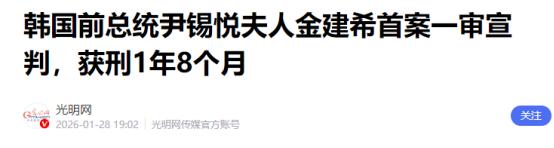 终于尘埃落定了 1月28日,韩国前总统尹锡悦的夫人金建希被判刑了! 法院最终认定她收受宗教团体高价礼品的罪名成立,判了1年8个月,还追缴了1281万韩元的犯罪所得,折合人民币大概6万多块。   金建希这次被判罪,核心就是收了不该收的礼,而且是跟宗教团体有关。法院认定的事实很明确,她收了韩国统一教送的高价礼品,像钻石项链、名牌包这些贵重东西,这在法律上构成了斡旋受贿。   可能有人不懂啥叫斡旋受贿,说白了就是她借着自己前第一夫人的身份,虽然不是公职人员,但能影响到相关事务,帮对方牵线搭桥或者提供便利,然后收受好处,这就触犯了法律。   有人可能会问,就收点礼品而已,至于判实刑吗?这里得说明白,韩国对政治人物及其家属的廉洁要求很严,尤其是第一夫人,法院在判决时就说了,第一夫人对总统有重大影响力,还代表着国家形象,必须行为得体、保持廉洁,就算做不到带头做好事,也绝不能当反面教材。   而且这次判的1年8个月实刑,真不算轻。要知道,韩国法律里斡旋受贿的法定最高刑期也就3年,她这已经接近中间偏上的量刑了。去年有个韩国议员的亲属收了两块劳力士手表,最后才判了1年缓刑,不用真坐牢,对比下来就知道金建希这判决的分量了。   不过话说回来,金建希被查的时候,可不是只这一项指控。一开始检方还告她操纵德意志汽车公司股价、从政治掮客那里白拿民调服务,这些都涉及违法犯罪。   但法院查来查去,发现操纵股价和白嫖民调这两项,证据都不够充分,没法认定她有罪,最后就只判了收受统一教礼品这一项。为啥这一项能定罪?因为证据链太全了,有僧人牵线搭桥的记录,有具体的礼物清单,还有金建希自己写的自首书,一环扣一环,想抵赖都不行。   金建希落到这步,绝不是偶然,她从跟着尹锡悦走进政坛开始,就没少惹争议。之前大家都夸她长得漂亮、气质好,是“最美第一夫人”,但随着尹锡悦竞选总统、上台执政,她的各种黑料就被一一扒了出来。   更关键的是,她跟尹锡悦的关系,也把两人都拖进了泥潭。尹锡悦之前是检察官,靠办李明博、朴槿惠这些大案,树立了“铁面检察官”的形象,可自从娶了金建希,就频频因为妻子的问题陷入被动。   尹锡悦自己也对幕僚说过,要是没遇到他,金建希本该过得很好,心里满是愧疚。这份愧疚,让他在任上一次次护着金建希,甚至不惜冒险。   最典型的就是,当时韩国国会想通过“金建希特检法”,专门成立特别检察官团队调查金建希的问题,这在韩国政坛是常规操作,之前几任总统都接受过。   可尹锡悦为了护着妻子,一次次否决这项法律。到了2024年11月,尹锡悦的处境越来越难,党内倒戈的人越来越多,特检法眼看拦不住了,他居然偷偷策划启动紧急戒严,理由之一就是怕特检组彻底查清金建希的问题。   可笑的是,他策划戒严这么大的事,连金建希都瞒着,当时金建希还在整形医院做诊疗,根本不知道丈夫在搞这么大的动作。等尹锡悦搞砸了回来,金建希当场就怒了,跟他大吵一架,喊着“因为你,全毁了”。   这之后,尹锡悦的日子就彻底垮了。2026年1月初,尹锡悦因为妨碍执行特殊公务罪,被一审判了5年有期徒刑。   才过了二十多天,金建希就又被判了1年8个月实刑,夫妻俩都成了犯人,这在韩国宪政史上是头一遭,从来没有前总统夫妇同时被判实刑的情况,说是韩国政坛的地震一点都不夸张。   可能有人会问,金建希现在已经被判刑了,还有挽回的余地吗?她的律师团队已经放话,考虑上诉,毕竟还有两项指控被判了无罪,他们想试着争取更好的结果。   而且金建希从2025年8月就被抓起来了,到现在已经关了快半年,按照韩国法律,之前被关押的时间可以折抵刑期,所以她实际需要再坐牢的时间会缩短一些,但不管怎么说,实刑的定性改不了,她已经是有犯罪记录的人了。   韩国民众对这事的态度也很明确,超过60%的人都觉得,政治人物及其家属就该严惩,不能搞特殊。之前金建希那些戴着奢侈品、享受特权的照片在网上传开后,大家对这些特权阶层的愤怒就越来越深。   虽然还有少数尹锡悦的支持者喊着“司法迫害”,但大多数人都认为,金建希是罪有应得,自己不廉洁,还借着第一夫人的身份搞特殊,落到这个下场都是自己造成的。   回顾金建希的经历,从被追捧的最美第一夫人,到如今沦为阶下囚,说白了就是没守住底线。   她总觉得自己是尹锡悦能当上总统的“第一功臣”,有资格享受特权、干预事务,却忘了不管身份多高,都得遵守法律。第一夫人这个身份,是荣誉也是约束,本该以身作则,她却反过来利用身份谋私利,收受贵重礼品,最终只能自食恶果。