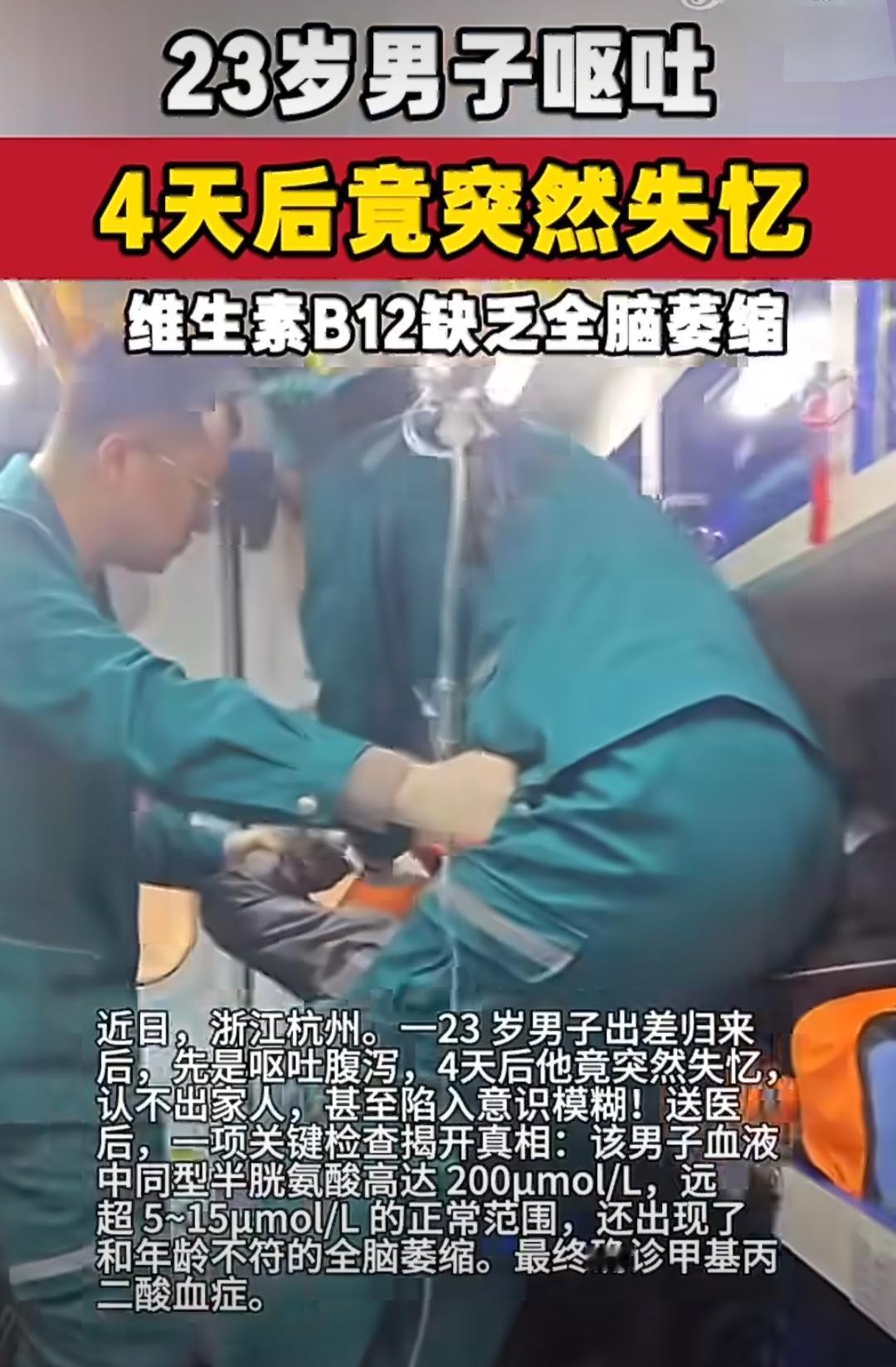 23岁正是身强力壮的年纪,可浙江湖州一位小伙子出差回来后,却遭遇了一场让人揪心的意外。刚回来时他只是呕吐腹泻,本以为是出差途中吃坏了肚子,没太当回事,可这症状一连持续了四天,谁也没想到,接下来竟发生了更吓人的情况——他突然失忆了,不仅认不出朝夕相处的家人,甚至陷入了意识模糊的状态,整个人都变得浑浑噩噩。 家人赶紧把他送进医院,一系列检查后,一项关键指标让医生找到了问题的根源。检查结果显示,他血液中的同型半胱氨酸含量高达200μmol/L,而正常范围只有5~15μmol/L,这个数值足足超出了正常水平十几倍。更让人意外的是,年仅23岁的他,还出现了和年龄严重不符的全脑萎缩,这在年轻人身上极为罕见。经过医生的进一步诊断,最终确定他患上的是甲基丙二酸血症,这是我国首批列入罕见病目录的遗传代谢病。 很多人可能没听过这种病,其实它和基因缺陷有关。小伙子体内天生缺乏一种特殊的酶,这种酶是帮助维生素B12发挥作用的关键。没有它,维生素B12就没法正常工作,导致体内的同型半胱氨酸代谢紊乱,越积越多。而这种物质超标后,会严重损伤神经系统,这也是他为什么会突然失忆、意识模糊的原因,长期下来还会对大脑造成不可逆的伤害,引发脑萎缩。 不过万幸的是,病因明确后,治疗方向就清晰了。医生针对性地为他补充维生素B12,没想到效果立竿见影,小伙子的病情很快就有了明显好转,最后顺利出院,总算躲过了一场大劫。这个案例也让很多人意识到,罕见病虽然少见,但危害不小,而且有些罕见病和遗传相关,早期发现和及时治疗至关重要。 无独有偶,还有一个3岁男童的情况也引发了大家的关注。这个小朋友因为长期看手机,竟然查出了400度的近视,要知道,这么小的孩子近视度数这么高,对未来的视力发育影响很大。现在不管是年轻人还是小朋友,都容易受到各种健康问题的困扰,年轻人可能因为遗传因素或不良生活习惯遭遇罕见病突袭,小朋友则可能因为电子产品使用不当影响视力。这些案例也提醒着大家,平时要多关注自己和家人的身体状况,出现异常症状别拖延,及时就医排查,同时也要养成健康的生活习惯,守护好自己和家人的健康。