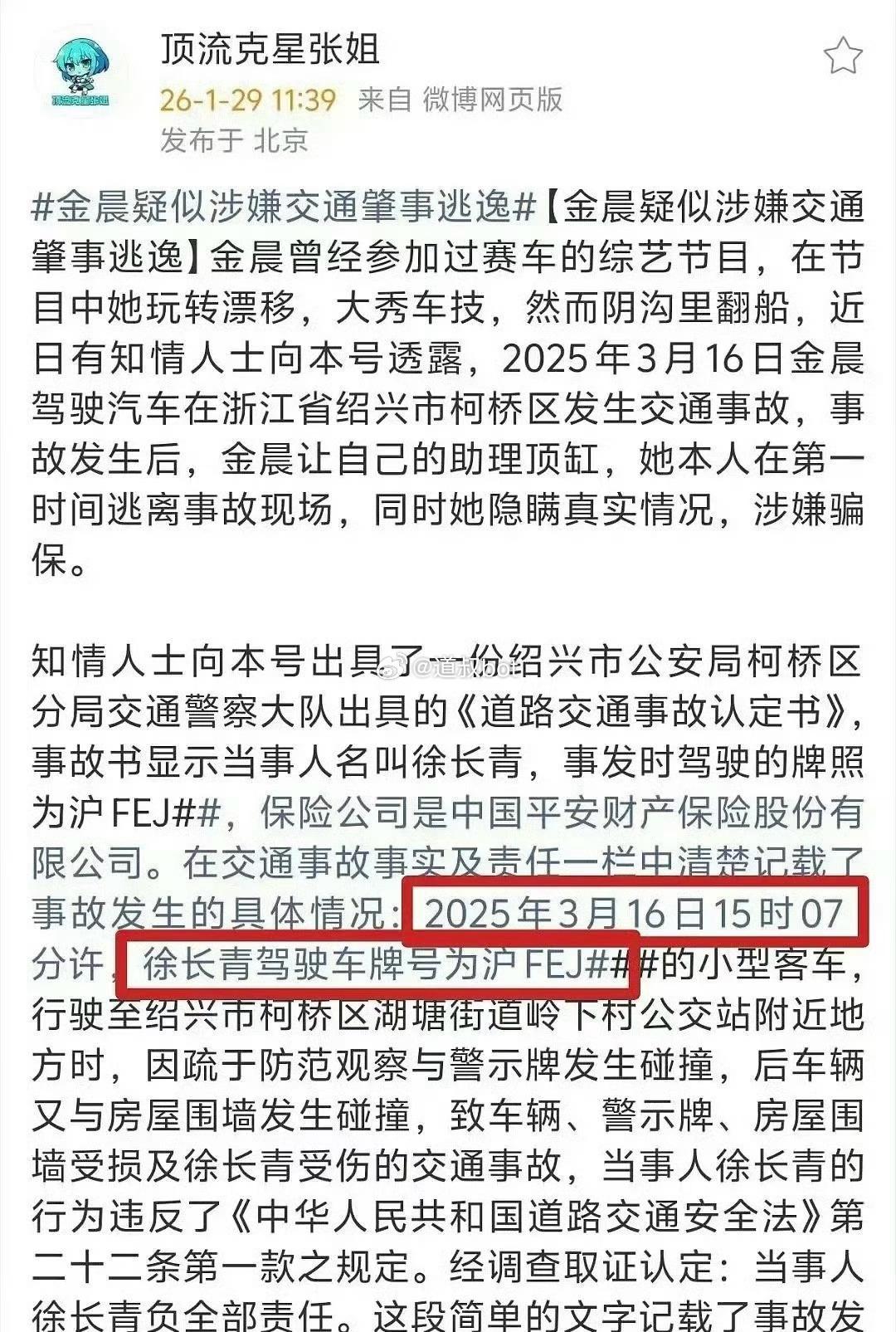 金晨被人举报涉嫌交通肇事逃逸,让人顶包,如果这个事件实锤,那是娱乐圈大瓜啊,意味着金晨演艺圈生涯结束。据有人爆料,他发布了当时事故现场金晨的监控截图,为事件增加证据。事件发生于2025年3月16日,位于绍兴柯桥湖塘镇下岭村公交站附近,一辆奔驰大G发生单边事故,撞到路边的交通指示牌,还和旁边房子发生碰撞,事后驾驶人徐长青接受了处罚和赔偿。但是爆料人说,当时驾驶汽车的是金晨,徐长青是被迫顶包的。这种交通事故,正常走保险就行,并不是大事,也不会有舆情。金晨这样做,有人猜测,只有几种情况:吸、喝或无证,她到底属于哪一种呢?看看金晨如何回应。金晨红毯造型 金晨跳舞