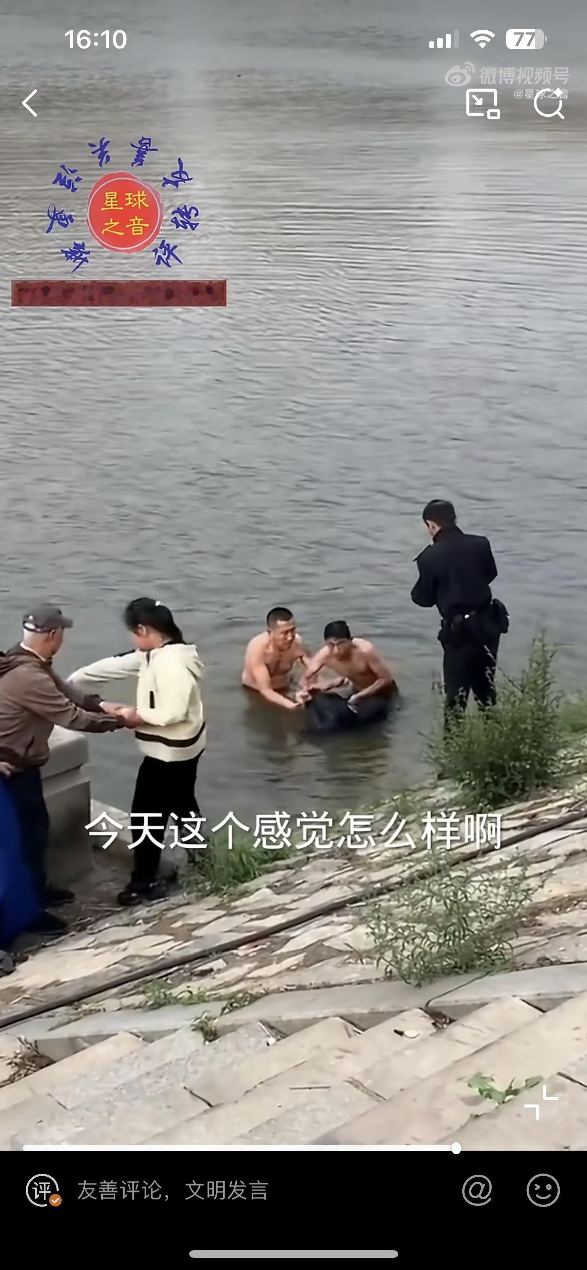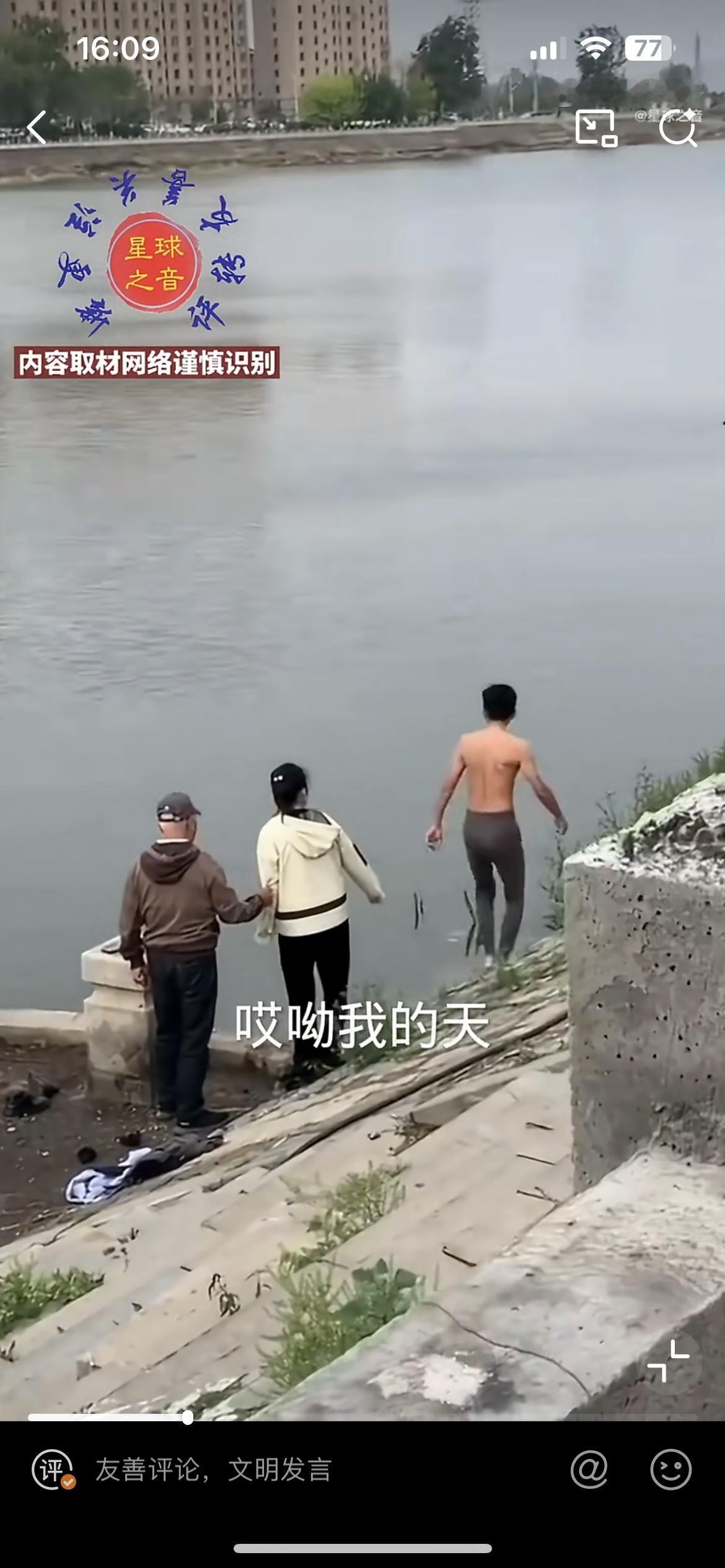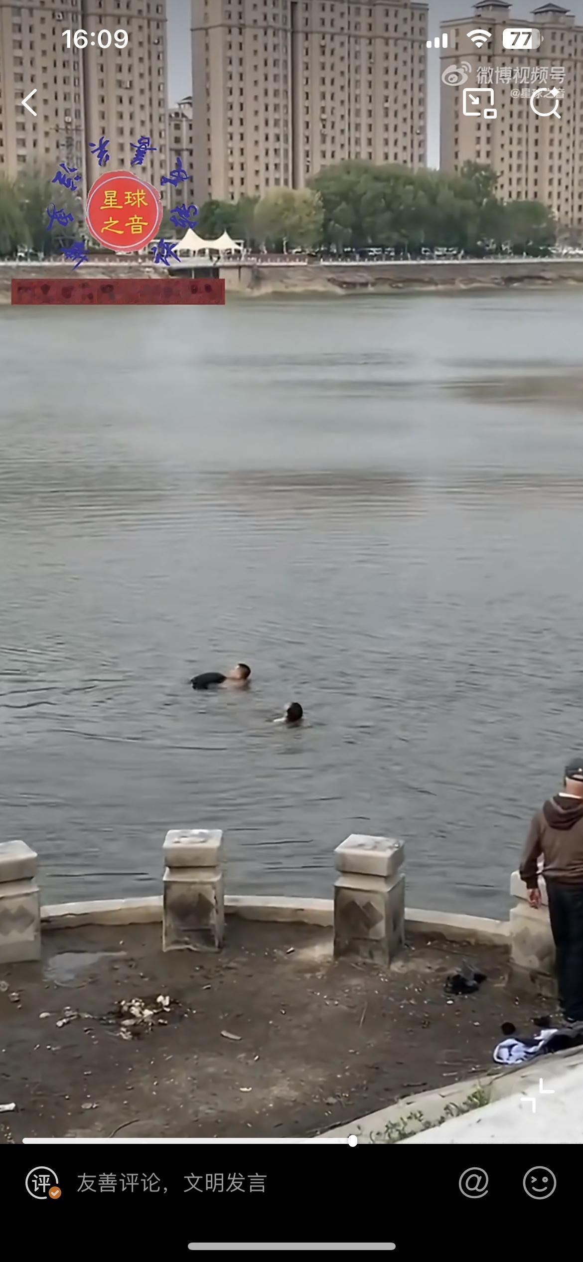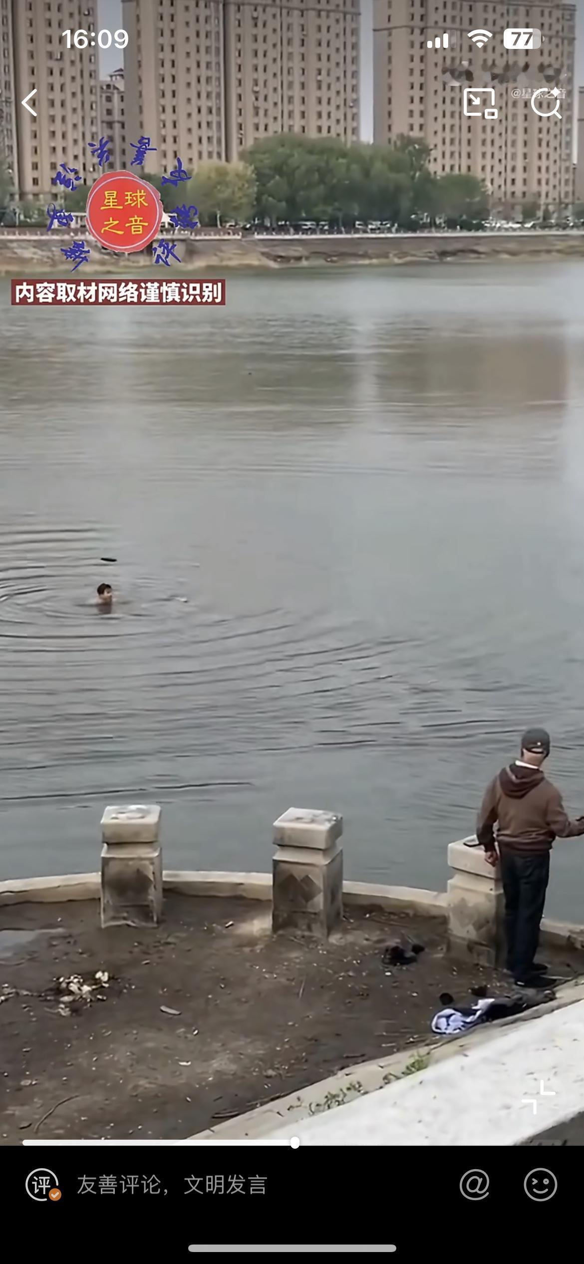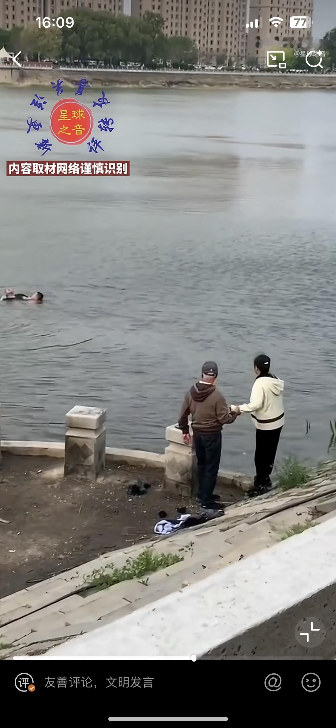 这个大哥太勇了,大冬天脱衣下水救人,半途体力不支,幸好又来一位大哥,两人合力把落水者救起来了。不知道什么原因,一个男子落水,在河里沉浮,这个身形瘦削的大哥不紧不慢脱掉外衣,一猛子扎入水中,把落水男子带到离岸边还有十来米的距离,自己体力不行了,这时另一个大哥游过来,接力把男子送到岸边,两人合力把男子拖上来。这时医生赶到,给男子做胸部按压急救。冬天下水救人