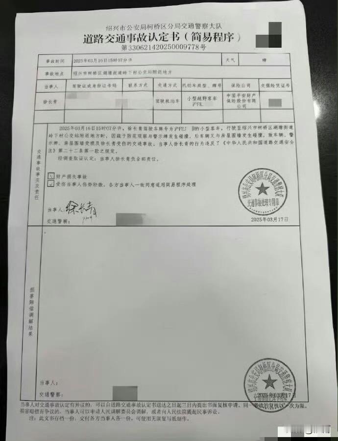 金晨被爆交通事故让助理徐某某顶替。从事发时现场图片来看,车辆受损并不算多严重,事故认定书里写道,事故原因是因为疏于防范,撞到了警示牌后,又和房屋围墙发生碰撞,所幸的是,人员无大碍。 在这份交通事故认定书上,当事人签名的是徐某某,也就是金晨的助理。 有知情人透露,其实当时开车的是金晨,她让助理顶替后,自己溜走了。 如果真的是这样,金晨算是一时糊涂了。这起事故本就没多么严重,处理起来也不麻烦。如果最后真发现是她让别人顶替,后果可能就严重了。 还是希望金晨赶紧出来解释一下吧。