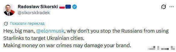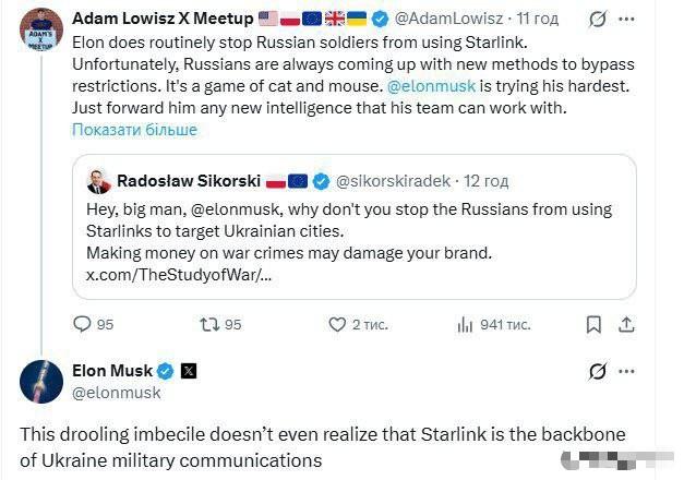 马斯克辱骂波兰外长为“蠢货”,回击其切断俄方星链服务的呼吁 1月下旬,美国战争研究所出了一份报告,说俄罗斯军队现在越来越会玩了,把马斯克旗下的星链系统装在了自己的无人机上,比如BM-35、“见证者”这些型号,装上星链之后,无人机的打击范围变大了,精度也提高了,从俄罗斯或者被他们控制的领土发射,能打到乌克兰大部分地区,甚至还能覆盖波兰、罗马尼亚的一部分。 这份报告一出来,波兰外长拉多斯瓦夫·西科尔斯基就坐不住了,直接在马斯克的社交平台X上@他,语气带着指责和施压:“嘿,大人物@埃隆·马斯克,你为什么不阻止俄罗斯人使用星链来瞄准乌克兰城市?靠战争罪行赚钱,可能会损害你的品牌形象。” 这话里话外,就是说马斯克明知俄罗斯在用星链搞袭击,还故意放任不管,靠着战争发不义之财,一点都不顾及自己的名声。 了解马斯克的人都知道,他从来不是那种会忍气吞声、讲外交客套话的人,西科尔斯基的话刚发出去没多久,他就火速回击,而且骂得相当直接,不止一次称西科尔斯基是“流口水的低能儿”“蠢货”,翻译过来就是咱们常说的“没脑子”“白痴”,一点情面都没留。 除了骂人,马斯克也明确说了自己的立场,他反驳说,西科尔斯基就是个外行,根本不懂星链在俄乌战场上的作用,“星链是乌克兰军队的骨干军事通信系统”,说白了,乌军现在打仗全靠星链撑着,不管是前线的指挥协调、情报共享,还是无人机的操控,离开星链基本上就玩不转。 马斯克言外之意很明显:我要是真听你的,切断俄方的星链使用,搞不好连乌军的通信也得受影响,到时候乌军的前线直接就崩了,这个责任你负得起吗? 可能有人会问,马斯克既然能控制星链,为啥不直接把俄罗斯的使用权给关了? 其实这里面藏着很多难处,不是他不想,而是真的做不到那么绝对。据乌克兰情报部门透露,马斯克的SpaceX公司从来没直接给俄罗斯卖过星链终端,俄军能用上,全是靠第三方走私、黑市交易,或者缴获乌军的终端,绕开了马斯克的管控。 星链是全球覆盖的卫星系统,想在战场上精准区分哪个终端是乌军在用、哪个是俄军在用,难度极大,要是一刀切全切断,受损最大的还是乌军。 而且这也不是马斯克和西科尔斯基第一次吵架了,俩人早就有过节。去年12月,马斯克因为旗下的X平台被欧盟罚了1.2亿欧元,气不过就发文说“欧盟应该被废除”,西科尔斯基当时就回怼他“飞火星去吧”,俩人算是结下了梁子。 之前马斯克还说过,波兰每年给乌克兰的星链费用就5000万美元,只是九牛一毛,根本算不上什么大投入,西科尔斯基却还反过来对他指手画脚,这也让马斯克很不爽。 就连美国国务卿鲁比奥后来都出来帮马斯克说话,说没有星链,乌克兰早就输了,还批评西科尔斯基散布虚假信息。 这场骂战根本不是两个人的私人恩怨,而是科技企业和地缘政治的碰撞。马斯克想保住星链的商业利益和技术中立,不想被卷入俄乌冲突的泥潭太深; 而西科尔斯基作为波兰外长,一边担心俄军的无人机威胁到自己国家,一边又想靠施压马斯克来改变战场态势,俩人的立场根本不一样,吵起来也就在所难免。 现在来看,马斯克大概率不会真的按照西科尔斯基的要求去做,毕竟星链一旦出问题,影响的是整个俄乌战场的格局,他犯不着为了一句指责,拿自己的企业和整个战局冒险。 而这场骂战,也让大家看清了一个现实:在战争面前,哪怕是像星链这样的高科技产物,也会变成一把双刃剑,既可能成为一方的“救命稻草”,也可能被另一方利用,而掌控这把剑的马斯克,不管怎么做,似乎都很难让所有人满意。