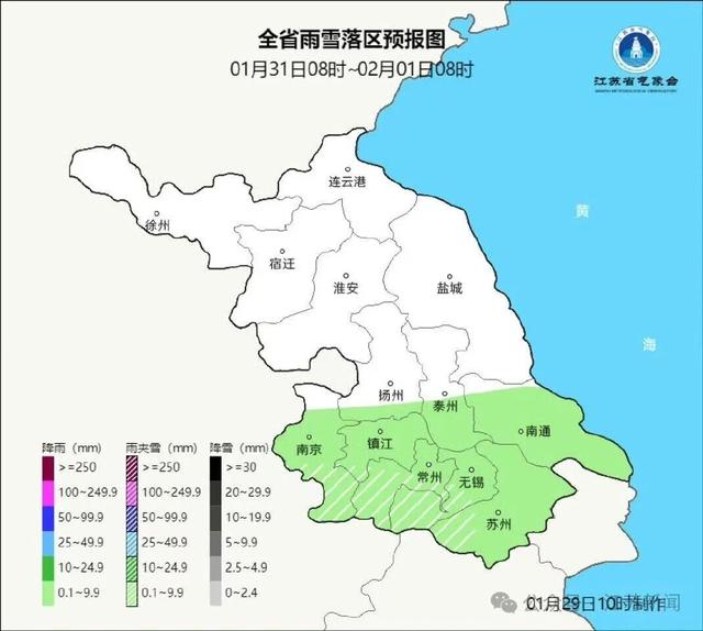 1月29日夜里至31日,江苏大部分地区有一次降水过程,期间雨雪相态复杂。29日夜里至30日白天,全省大部分地区降雨为主,雨量小到中等,徐州、宿迁、淮安有短暂雨夹雪或小雪。