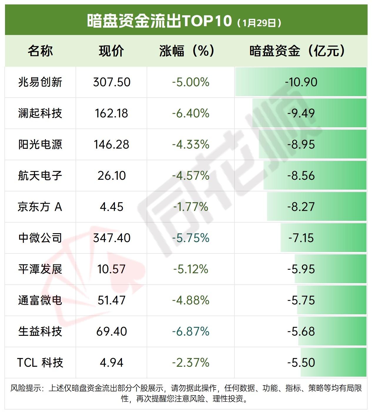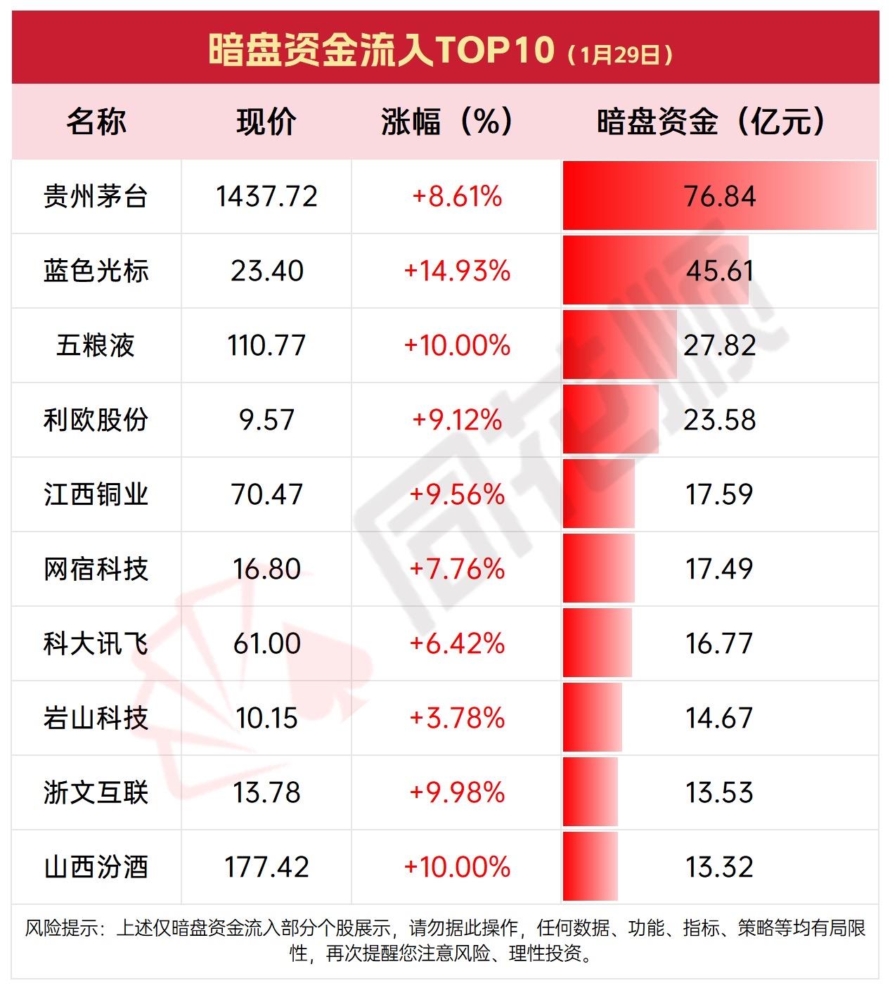 1月29日暗盘资金流入TOP10,1月29日最新数据! 茅台领涨暗盘流入榜,蓝标五粮跟涨。资金热涌科技消费股,理性投资勿盲从。
