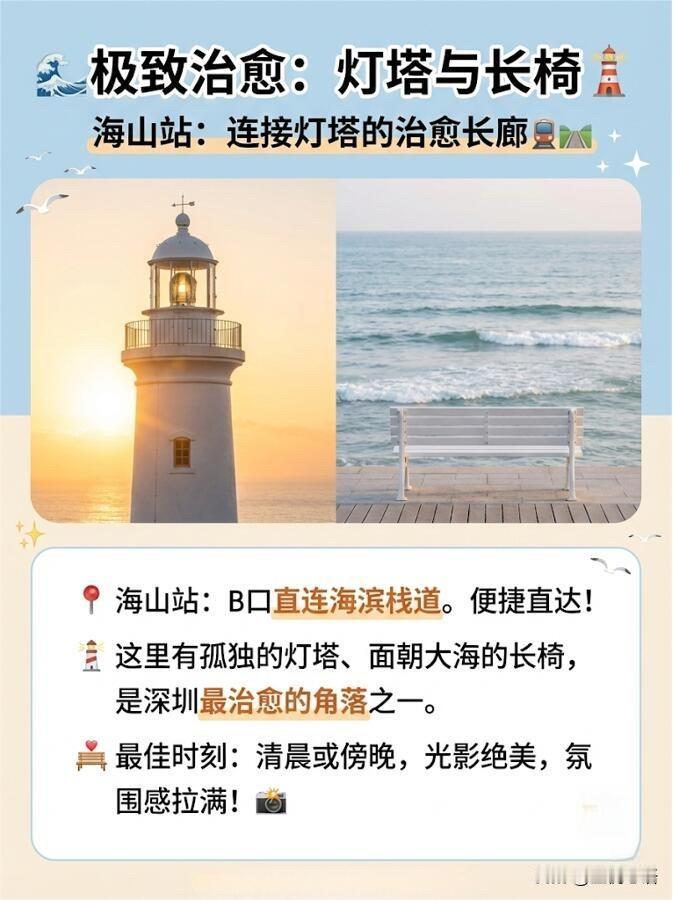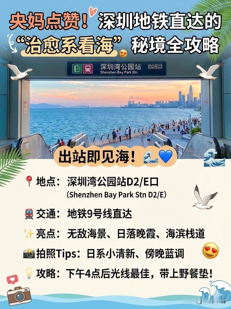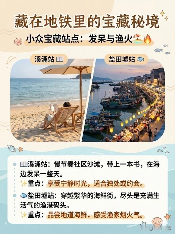 深圳地铁看海全攻略:出站即拥果冻海 必冲核心站点(地铁直达+绝美体验) • 大梅沙站(8号线):A/B口步行200米达沙滩,海水清透如果冻,踏浪、吹海风超治愈,拍照巨出片。 • 小梅沙站(8号线):人少景幽,左转沙滩右转礁石栈道,毗邻海洋世界,带娃、...