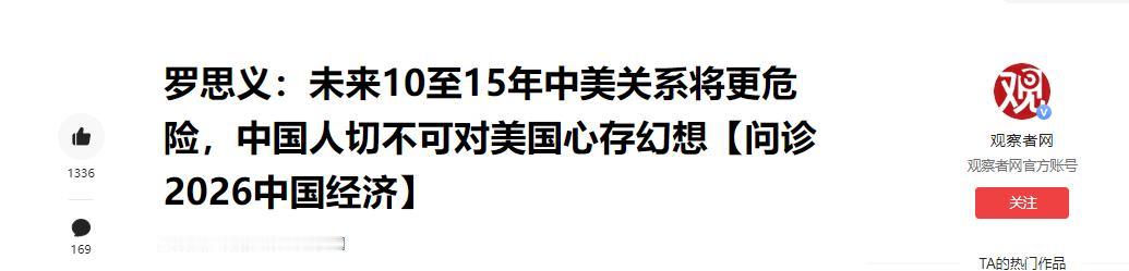 英国著名学者罗思义就未来中美关系以及核战争发出预言。 他说,中国有些人认为,中美之间的和平是必然的,因为核战争不可思议。对此,我不得不说,他们太天真了,竟然对美国抱有不切实际的幻想! 发出这番振聋发聩警告的,是前英国伦敦经济与商业政策署署长、现任中国人民大学重阳金融研究院高级研究员罗思义。 在 2026 年 1 月 26 日的一场关于中国经济与地缘政治的深度对话中,他撕开了西方温情脉脉的面纱,将血淋淋的现实摆在了我们面前。 罗思义从不是空喊口号的学者,他吃透了西方的政治逻辑,也看遍了美国的霸权操作,更扎根中国研究了数十年的发展脉络。他的这番话,不是危言耸听的噱头,而是基于现实的理性判断,更是给那些沉浸在 “和平必然论” 里的国人,浇了一盆彻头彻尾的冷水。 别再用中国人的和平思维,去揣度美国的霸权逻辑了。中国始终信奉和为贵,觉得经济上你中有我、我中有你,就不会走到军事对抗的地步,更别说核战争这种极端情况。 可美国从来不是这样的出牌思路,它反对中国,从来不是因为意识形态的差异,只是因为中国的强大,动了它全球霸主的蛋糕。 现在的美国,早就没了当年一家独大的经济底气,GDP 占世界比重不到 20%,而中国的经济增速始终是它的 2.5 倍,哪怕增速有所放缓,也能稳稳保持 5% 左右的水平。 照这个趋势走下去,用不了十几年,中国的经济规模就会全方位超越美国,这是美国无论如何都无法接受的现实。 经济霸权守不住,美国就把所有希望押在了军事霸权上。它的军费支出超过了其后九个国家的总和,手握全球最庞大的军事力量,这就让它产生了强烈的军事对抗诱惑。 罗思义直言,美国军方内部有 10% 到 15% 的人,正盼着和中国来一场直接或间接的军事冲突,这可不是随口说说的空话,而是实打实的风险信号。 更可怕的是,核战争在美军的战略里,从来都不是不可触碰的红线。美国是全世界唯一在实战中使用过核武器的国家,它从骨子里就没有把核武当成最后的底线,只要它自认为能在核战争中取胜,就敢毫不犹豫地按下启动键。那些觉得 “核战争不可思议” 的人,恰恰是低估了霸权国家为了保住地位,能做出多么疯狂的事。 美英澳搞的核潜艇联盟,就是最直白的证明。一个无核国家,被美国和英国公然扶持搞核动力潜艇,明着是打造军事同盟,实则就是在降低核使用的门槛,为未来的核博弈铺路。美国一边喊着核不扩散,一边干着核扩散的勾当,这样的国家,何来的底线可言? 更何况,美国的对华政策,早就被军工复合体牢牢绑架了。早在几十年前,美国前总统艾森豪威尔就警告过,军工复合体会渗透政府的每一个角落,而现在,这个预言早已成为现实。 俄乌冲突让美国的军火商赚得盆满钵满,股价一路飙升,这些靠战争吃饭的利益集团,迫切需要一个新的 “敌人” 来制造恐慌,来索要更多的军费预算。 中国,就是他们选定的最佳目标。美国国防部年年发布所谓的中国军力报告,满嘴跑火车地渲染 “中国威胁论”,本质上就是为了给军工复合体找借口,让国会批下更多的钱,让军火商继续赚得盆满钵满。在这样的利益驱动下,美国的对华强硬,早已成了政治正确,没有任何缓和的余地。 更值得警惕的是,美国两党在反华这件事上,早就达成了高度共识。不管是民主党还是共和党上台,都把中国当成了比冷战时期苏联更强大的竞争对手,科技封锁、产业链脱钩、印太战略围堵,全方位的遏制手段轮番上阵。 美国的新版国家安全战略里写得明明白白,它从来没想过退守西半球,800 个海外军事基地摆着,就是为了继续掌控世界,先打压中国的友好国家,再回头对付中国,这才是它的真实算盘。 还有人觉得,中美之间的经济依存度这么高,美国不会真的撕破脸。可在霸权的逻辑里,遏制竞争对手永远比互利共赢更重要。美国宁愿自伤八百,也要损中国一千,哪怕搞脱钩会让自己的经济受损,它也在所不惜。这种看似不理性的选择,恰恰是美国维护霸权的必然选择。 罗思义说,未来 10 到 15 年,是中美关系最危险的时期,这话一点都不假。因为按照当前的发展速度,中国大约还需要 15 年的时间,才能在军事上真正赶超美国,只有当中国的军力强大到让美国确信,自己无法取得先发制人打击的胜利时,它才会真正放弃发动攻击的念头。 这 10 到 15 年,就是美国最后的疯狂期,它会用尽一切手段,来延缓中国的发展,甚至不惜挑起冲突。罗思义的警告,从来都不是为了制造恐慌,而是为了让国人清醒。 和平从来都不是求来的,也不是靠幻想得来的,而是靠实力捍卫的。中国从来不想和美国发生冲突,始终一心搞发展,但这并不意味着我们要放下警惕。 丢掉对美国的不切实际的幻想,把自己的实力搞强,把国防建设抓实,让美国不敢轻易动手,这才是应对一切风险的根本,也是对和平最好的守护。