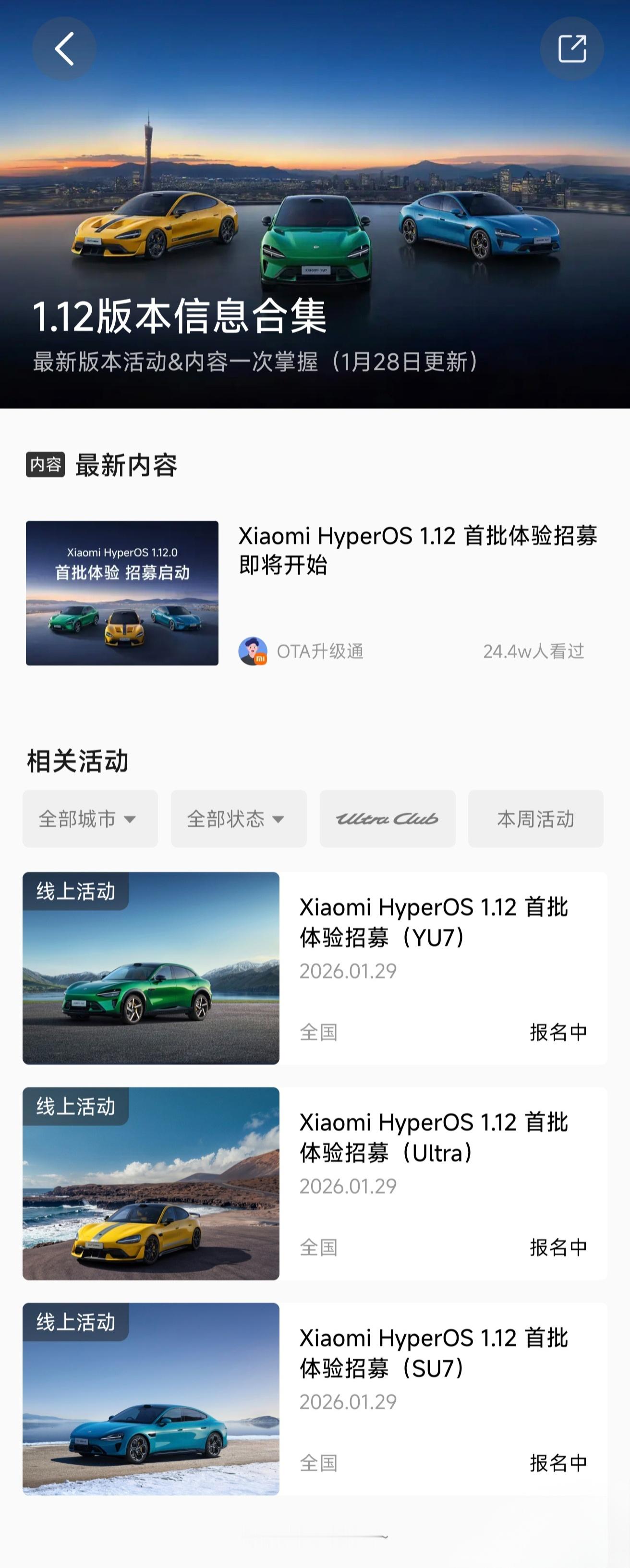 小米汽车 SU7、YU7、SU7Ultra三款车型开启HyperOS1.12版本体验招募。报名时间为1月29日11:00至23:59。小米SU7车型首批招募限量9000个名额,YU7限量6000个名额,SU7Ultra限量2000个名额应该是新版本系统即将向部分车主推送,这些车主会先体验新版本的各个功能