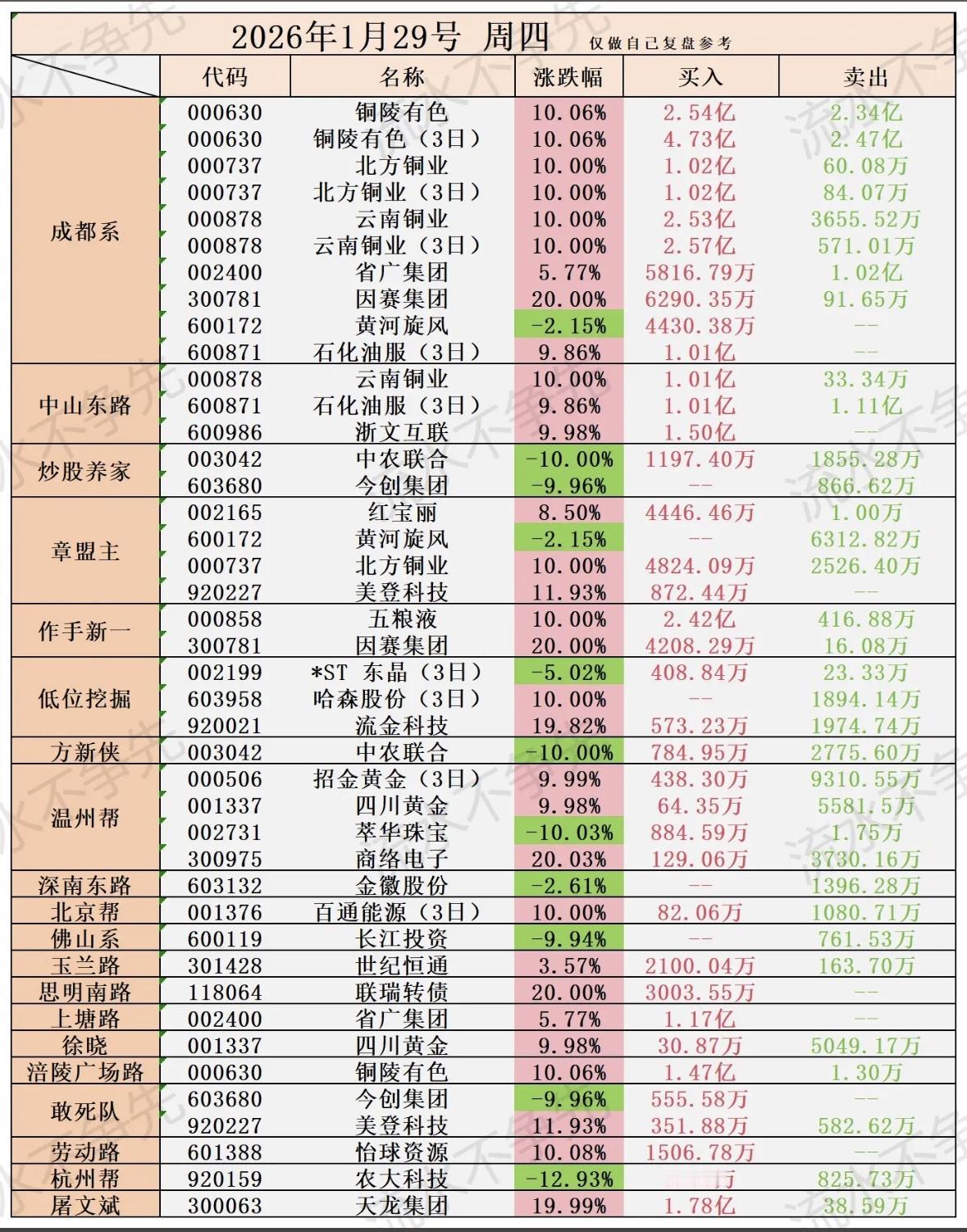 2026年1月29日柚子龙虎榜股票涨跌榜,带你一探究竟! "铜陵有色、北方铜业领涨,多股异动明显,游资活跃度攀升,市场热点分散需谨慎。"