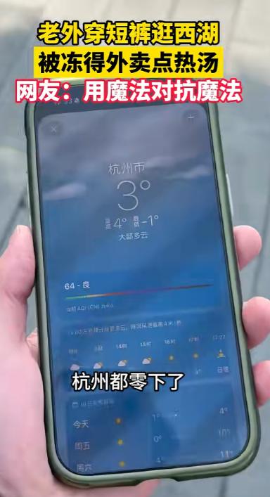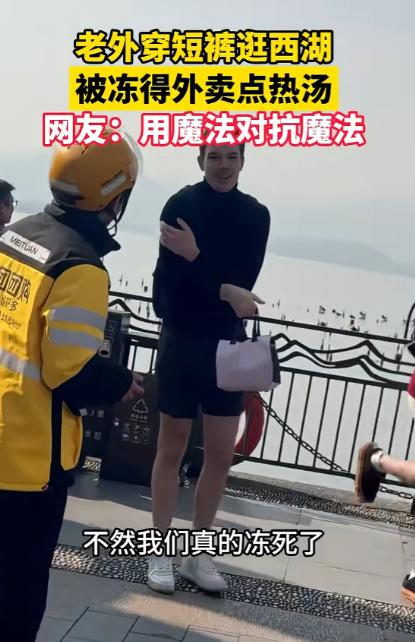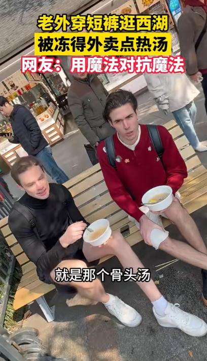 也是没谁了!杭州,一男子在西湖边游玩时,意外看到2个外国人穿着短裤在漫步,不禁感叹“老外这么抗冻的吗?”谁知,没过一会儿,老外就朝着不远处一个外卖员打起了招呼,男子以为他们点的是保暖类的衣物,结果发现并不是! 1月23日,来杭州的旅游的游客个个裹得严严实实,羽绒服、加绒裤、围巾帽子手套齐上阵,就连土生土长的杭州本地人,出门都恨不得裹上两层毛衣,谁都不想跟这南方的湿冷硬刚。 一位男子趁着天晴来西湖边走走,眼角余光突然瞥见两个外国小伙慢悠悠地沿着湖边步道走,这一眼直接让他停下了脚步,手里的热奶茶都忘了喝。 这两个老外上身就穿了件薄款的卫衣,下身竟是利落的短裤,脚上也就一双普通的运动鞋,就这么在寒风里晃悠,俩人还时不时抬头看看西湖的景色,一副悠然自得的样子。 男子站在原地看了半天,心里满是疑惑,老外这么抗冻的吗?这天气我们裹成粽子都觉得冷,他们穿短裤还能逛得这么惬意。 不光是这位男子,周围的游客注意到这两个 “勇士” 后,也都纷纷侧目,不少人拿出手机偷偷拍照,还有人小声议论,猜测是不是外国人的体质本就跟我们不一样,天生耐冻。 有人说看着俩人的穿着,还以为是刚从热带过来,没来得及换衣服,也有人打趣说这俩人怕是不知道南方冬天的厉害,还把杭州的冬天当成了海南的暖阳。 大家就这么看着俩人沿着湖边走,从断桥走到平湖秋月,一路上吸引了不少目光,成了西湖边一道特别的风景。 只是没人注意到,这两个老外的脚步慢慢慢了下来,一开始的悠然自得也渐渐消失,走着走着开始不自觉地缩脖子。 双手搓着胳膊,偶尔还会踮踮脚、跺跺脚,嘴角的笑容也淡了,脸上的表情慢慢变得有些僵硬,显然是扛不住这刺骨的湿冷了。 就在这时,其中一个老外眼睛一亮,朝着不远处的树荫下挥了挥手,一位外卖员快步走过来,将手里的外卖送到身穿黑色上衣的老外手中。 这一幕让围观的游客都来了兴致,这位男子也凑了点过去,心里想着这俩人总算是扛不住了,估计是点了保暖的东西,要么是暖宝宝、暖手宝,要么是厚裤子厚外套,毕竟西湖边的景区里,想要立刻买到保暖衣物并不容易,点外卖倒是最快捷的方式。 两个老外接过保温袋,迫不及待地打开,结果里面的东西让所有人都愣了,哪里是什么保暖衣物,分明是两碗热气腾腾的骨头汤。 保温袋里打开的瞬间,浓郁的香味飘了出来,热气裹着香味在冷风中散开,看着就让人觉得暖和。 两个老外也顾不上周围人的目光,端着碗就喝了起来,吸溜着热汤,舌头舔了舔嘴唇,脸上的表情瞬间舒展开来。 其中一个老外一边喝,一边用中文跟身边的同伴说,太冷了,骨头缝都冻疼了,听说中国有吃啥补啥的说法,骨头冷就喝骨头汤,肯定能补回来。 另一个老外连连点头,手里的碗就没放下过,大口大口地喝着热汤,一碗汤下肚,俩人都长长地舒了口气,搓着腿的手也停了,脸上终于恢复了点血色。 后来大家才知道,这两个老外是从海南一路玩到杭州的,以为南方的冬天都像海南一样温暖,没做任何保暖准备,就带着短袖短裤来了。 谁知道杭州的冬天这么冷,逛了没多久就冻得受不了,这才想起点外卖,还特意选了一碗热腾腾的骨头汤,想着用中式养生的方法来取暖。 外卖员看着俩人的样子也笑了,说自己接到订单的时候还纳闷,西湖边居然有人点骨头汤,送过来才发现是两个穿短裤的老外,还特意给他们多套了一层保温袋,生怕汤凉了。 两个老外喝完一碗骨头汤,又把另一碗也打开喝了,两碗热汤下肚,俩人明显缓了过来,虽然还是穿着短裤,却不像之前那样冻得瑟瑟发抖了。 这一幕被游客拍下来发到了网上,很快就火了,网友们看到后都乐坏了,纷纷留言调侃。 说这真是正宗的用魔法对抗魔法,杭州的湿冷是魔法攻击,老外就用地道的中式养生魔法来应对,吃啥补啥的骨头汤安排得明明白白。 有人说这俩老外算是把中国的养生智慧悟透了,也有人说这是南方冬天给老外上的生动一课,让他们知道了南方冬天的厉害。 一碗热汤,驱散了零下的寒意,也让大家看到了不同文化碰撞的小美好,毕竟在寒冷的冬天里,一碗热腾腾的汤,永远是最治愈的存在。 对于这件事,您有什么想说的吗?欢迎评论区留言讨论。 信源:新华社2026-01-27——《外国小伙冬天穿短裤逛杭州西湖,被冻到当场点热汤外卖暖身。网友:他们还知道吃啥补啥!》