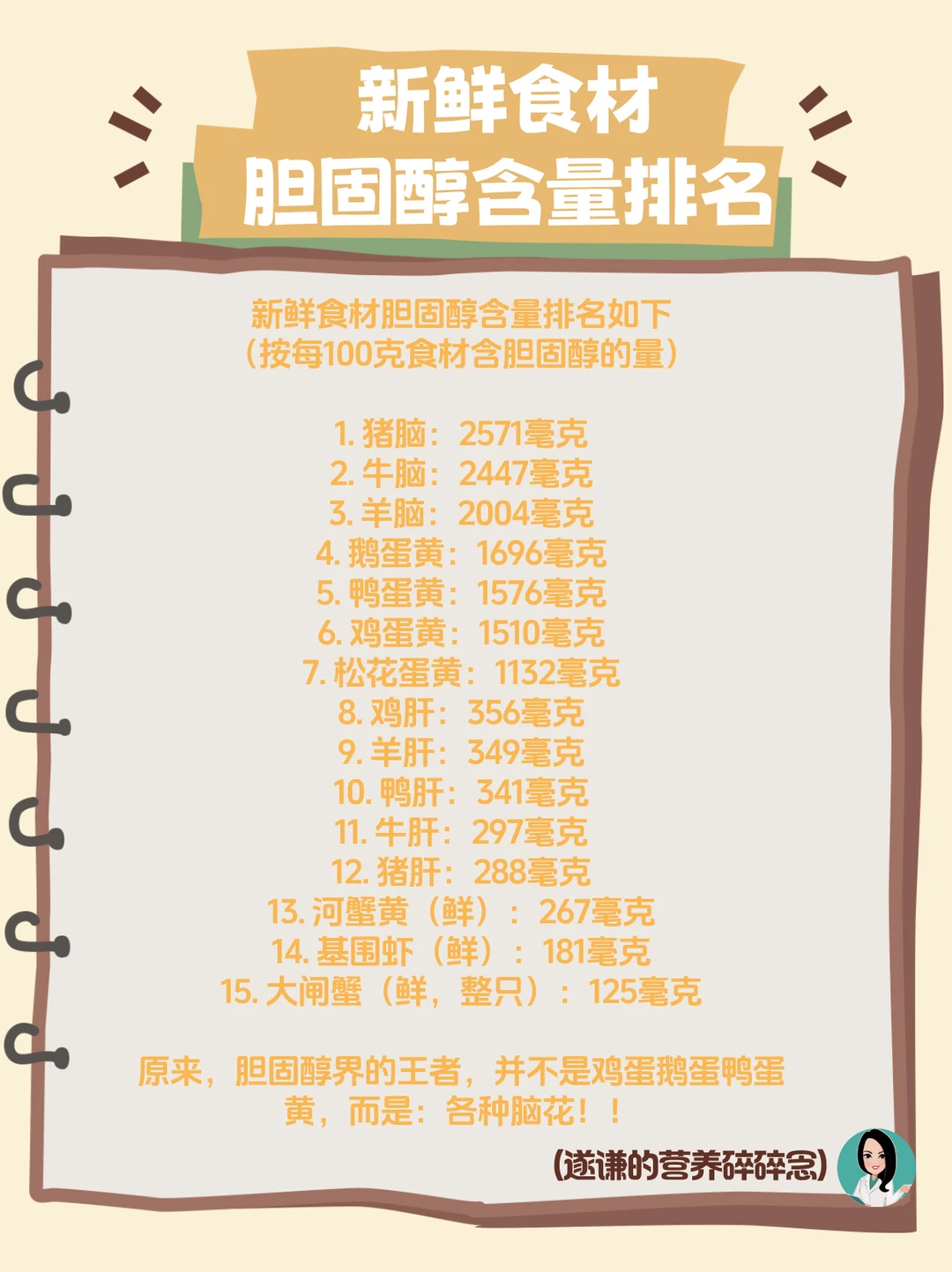 很多人以为鸡蛋黄的胆固醇高,其实,它也就是个星耀,跟王者的——猪脑花 的胆固醇含量差着数量级的差别! 来,新鲜食材胆固醇含量排名如下(按每100克食材含胆固醇的量) 1. 猪脑:2571毫克 2. 牛脑:2447毫克 3. 羊脑:2004毫克 4. 鹅蛋黄:1696毫克 5. 鸭蛋黄:1576毫克 6. 鸡蛋黄:1510毫克 7. 松花蛋黄:1132毫克 8. 鸡肝:356毫克 9. 羊肝:349毫克 10. 鸭肝:341毫克 11. 牛肝:297毫克 12. 猪肝:288毫克 13. 河蟹黄(鲜):267毫克 14. 基围虾(鲜):181毫克 15. 大闸蟹(鲜,整只):125毫克 看到没,⚠️ 胆固醇界的王者,并不是鸡蛋鹅蛋鸭蛋黄,而是:各种脑花 [哈哈][哈哈](爱吃脑花的人轻轻碎了🫠🫠 你可能会惊叹:鸡蛋黄胆固醇含量这么高么?!!!! 📝 别怕,这是100克鸡蛋黄的胆固醇含量,而不是100克鸡蛋。而鸡蛋清胆固醇含量可以忽略不计的。所以,真正“摊到”一个鸡蛋里的胆固醇的量是这样的: ✅ 日常吃1个中等大小的鸡蛋(约50克),摄入胆固醇约290毫克左右。 说到脑花,我二十来岁的时候,超爱红油火锅涮猪脑花……自从深造临床营养后,就把这个爱好戒了