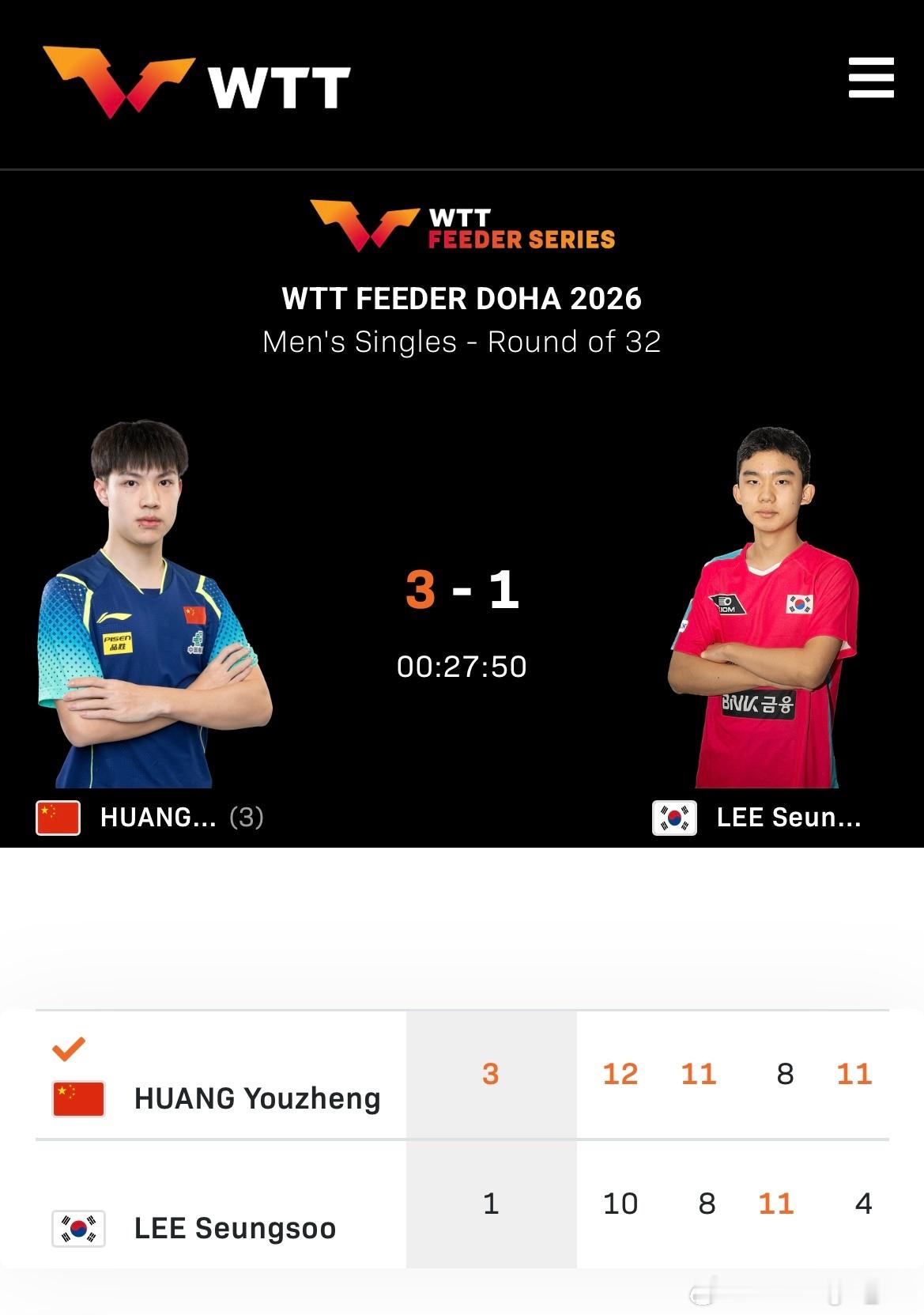 WTT支线赛多哈站2026 男单1/16决赛:🇨🇳黄友政3比1李承洙🇰🇷(12-10,11-8,8-11,11-4)下一轮🆚徐海东🇨🇳