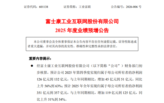 公告显示,工业富联2025年第四季度预计实现归属于母公司所有者的净利润126亿元至132亿元,较上年同期增加45亿元至51亿元,同比上升56%至63%;扣除非经常性损益后,预计实现归母净利润124亿元至130亿元,同比增加37亿元至43亿元,增幅达43%至50%。