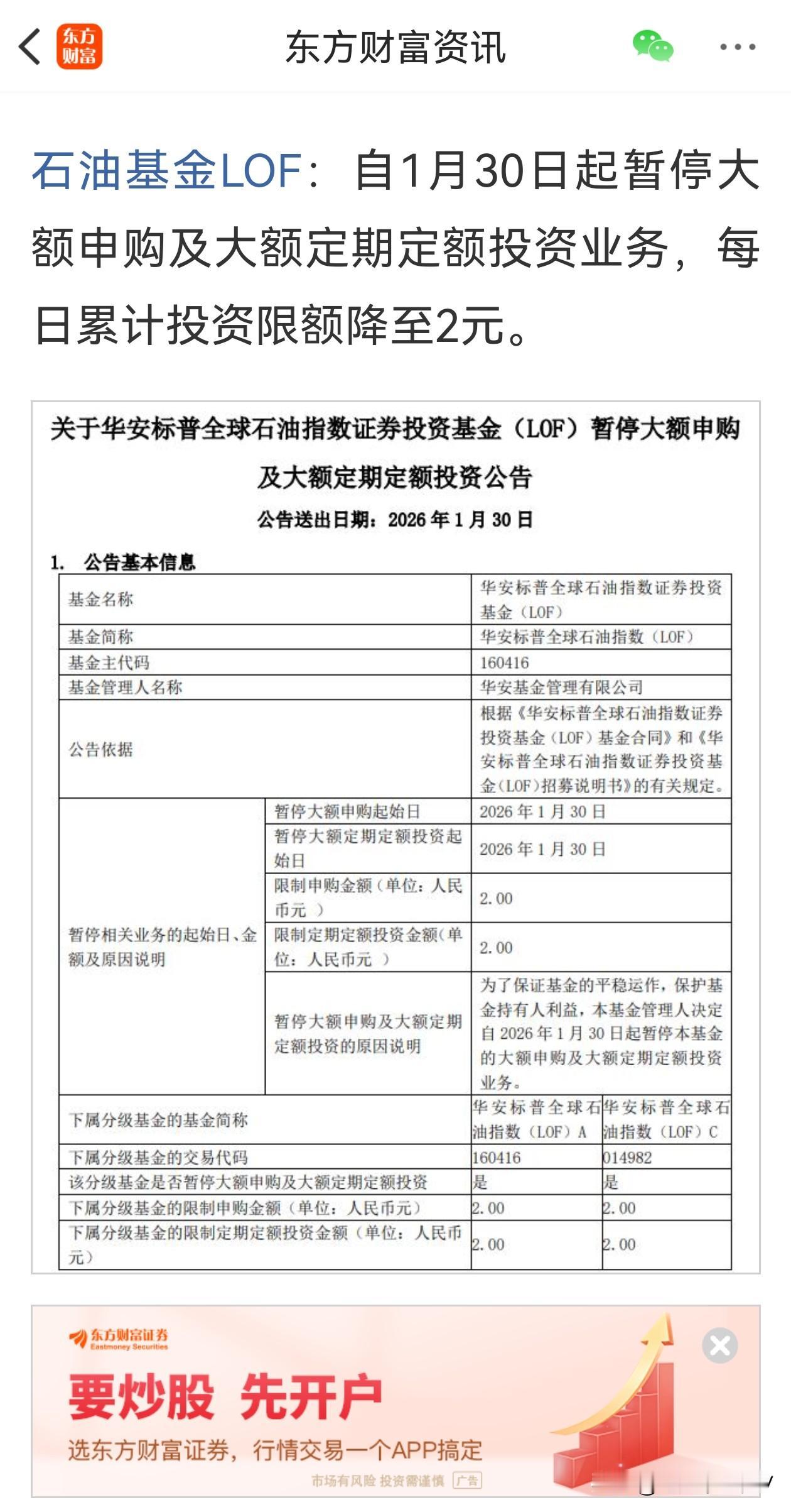 继白银黄金基金限购以后 石油基金也开始限购了,之前白银基金限购 100 元,然后直接关闭了。石油基金这下直接限购 2 元,哈哈哈,2 块钱够干啥的,涨幅 10%,也就两毛钱,还不够买个包子吃的呢!