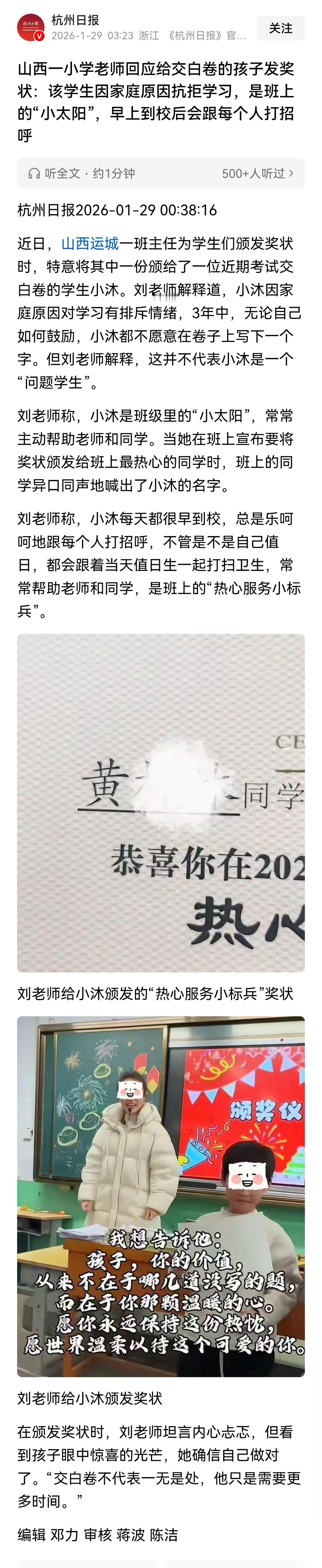老师发给这名学生奖状,是奖励他是“热心服务小标兵”,这是对学生不同角度的评价,而非只按学习成绩评价。每个孩子都有自己的闪光点,针对个体的评价就要关注孩子的闪光点,这可以提高学生对自我的认同,也促进他们成长、进步。