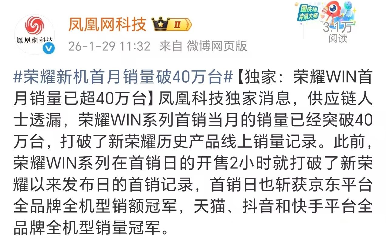 荣耀新机首月销量破40万台 没想到荣耀WIN卖得这么好,比友商晚发一个月还能逆袭。荣耀WIN把“最强旗舰芯片+直吹风扇+超大电池”组成了电竞手机的铁三角,算是给游戏手机定了性——不是只加个风扇就完事,三者缺一不可。荣耀在高端机上直接上了内置风扇,其他大厂大概率也会跟上。或许明年开始,没风扇的高性能旗舰反而像缺了点什么。说到底,玩家要的从来不是参数,是实打实不烫手、不掉帧的畅快。
