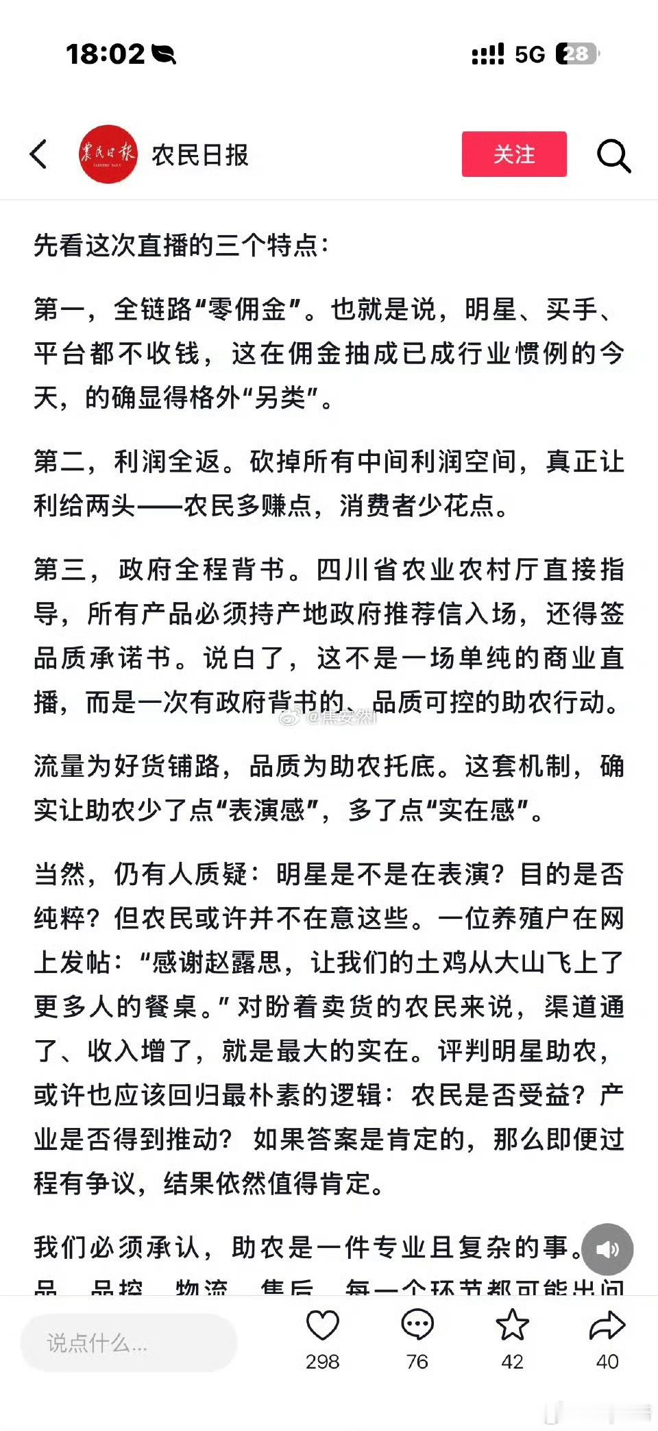 农民日报发文肯定助农直播农民日报肯定助农直播 农民日报发文肯定了助农直播这一0回报的艺人行为!用自己的影响力帮助农业的生产生活建议以后能多开几场助农直播赵露思