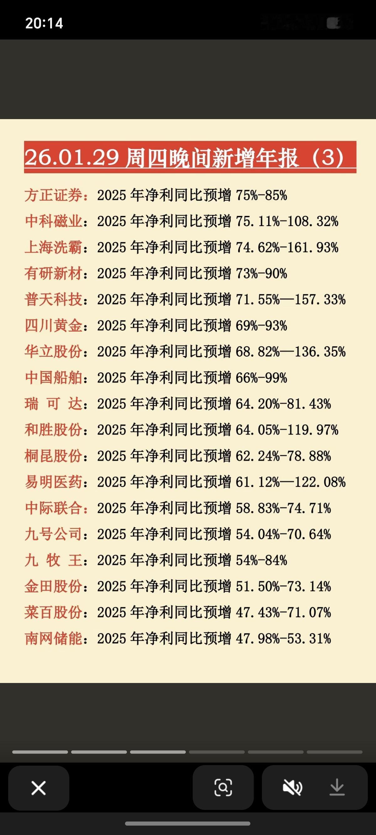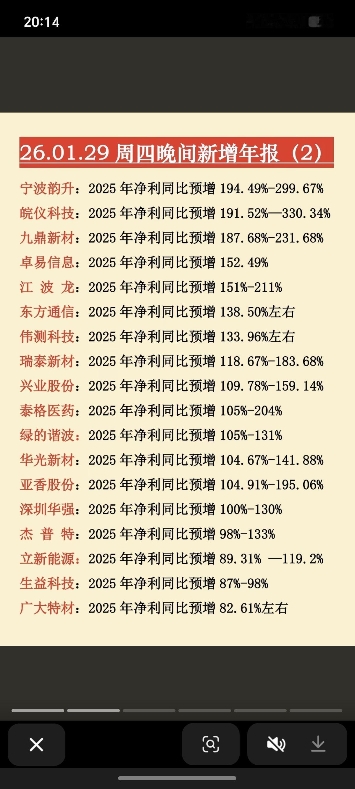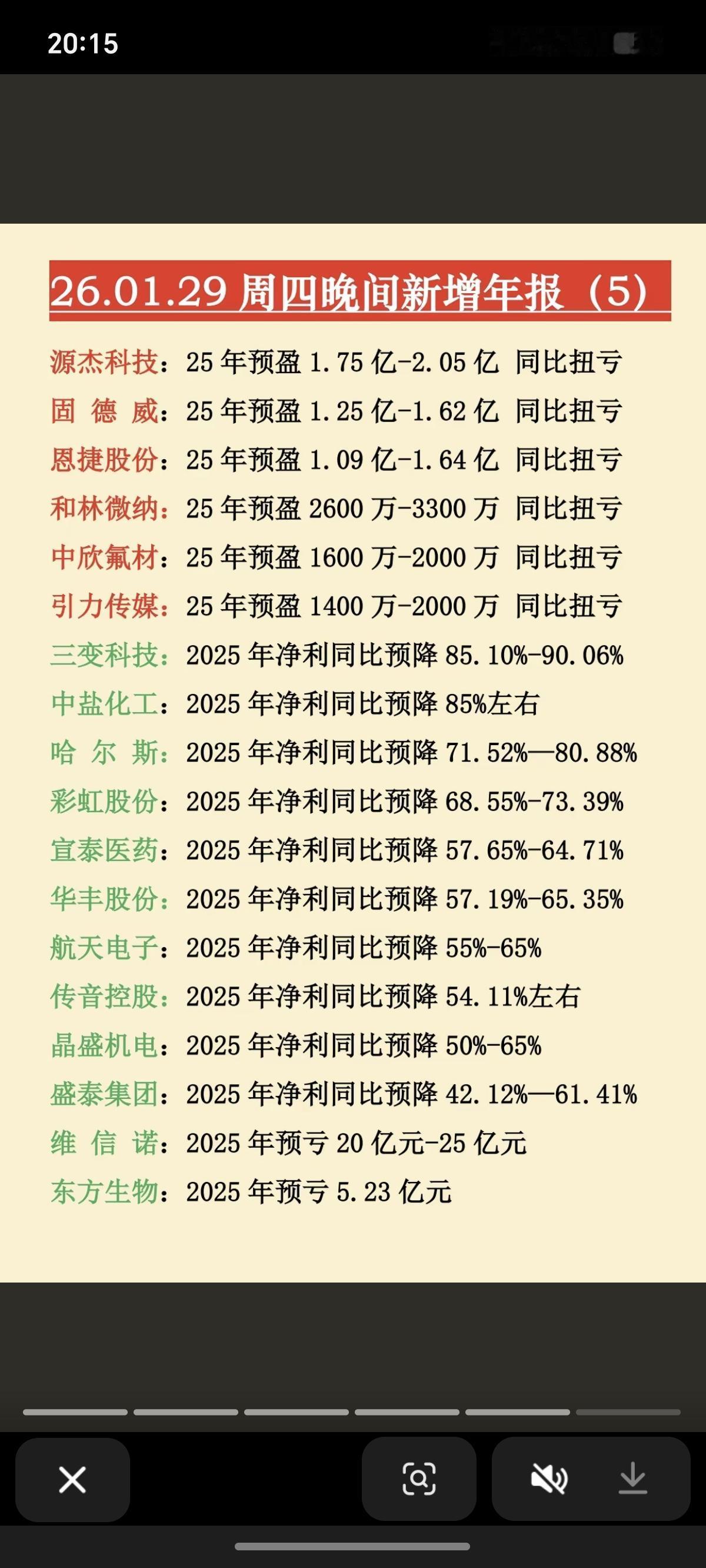 1.29周四 新增:上市公司年报业绩预告 20家年报业绩亏损,10家公司业绩预降。 业绩不佳的,短期回避。